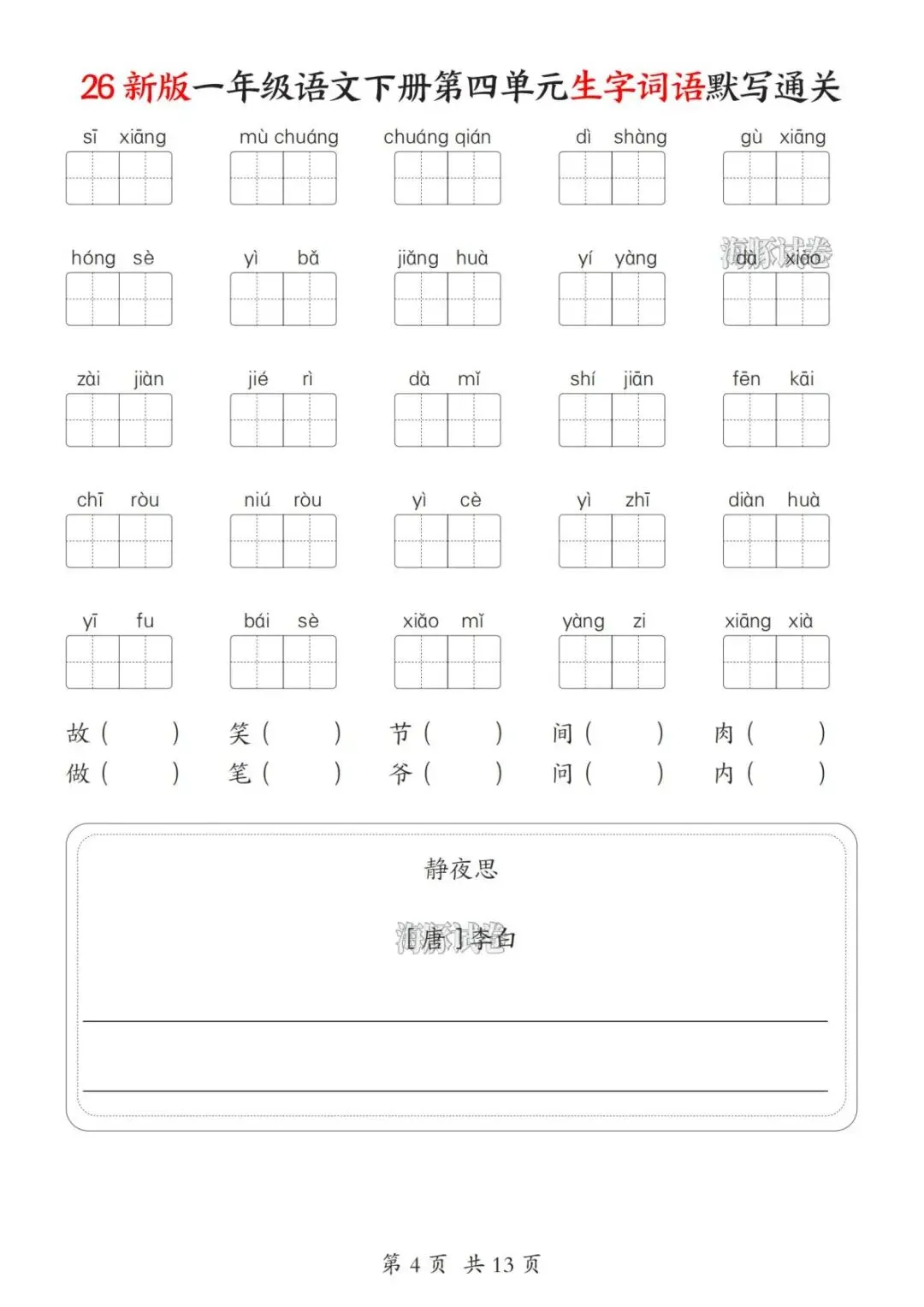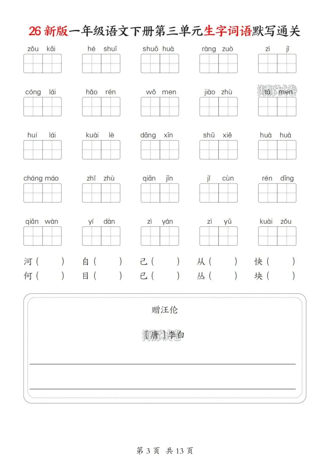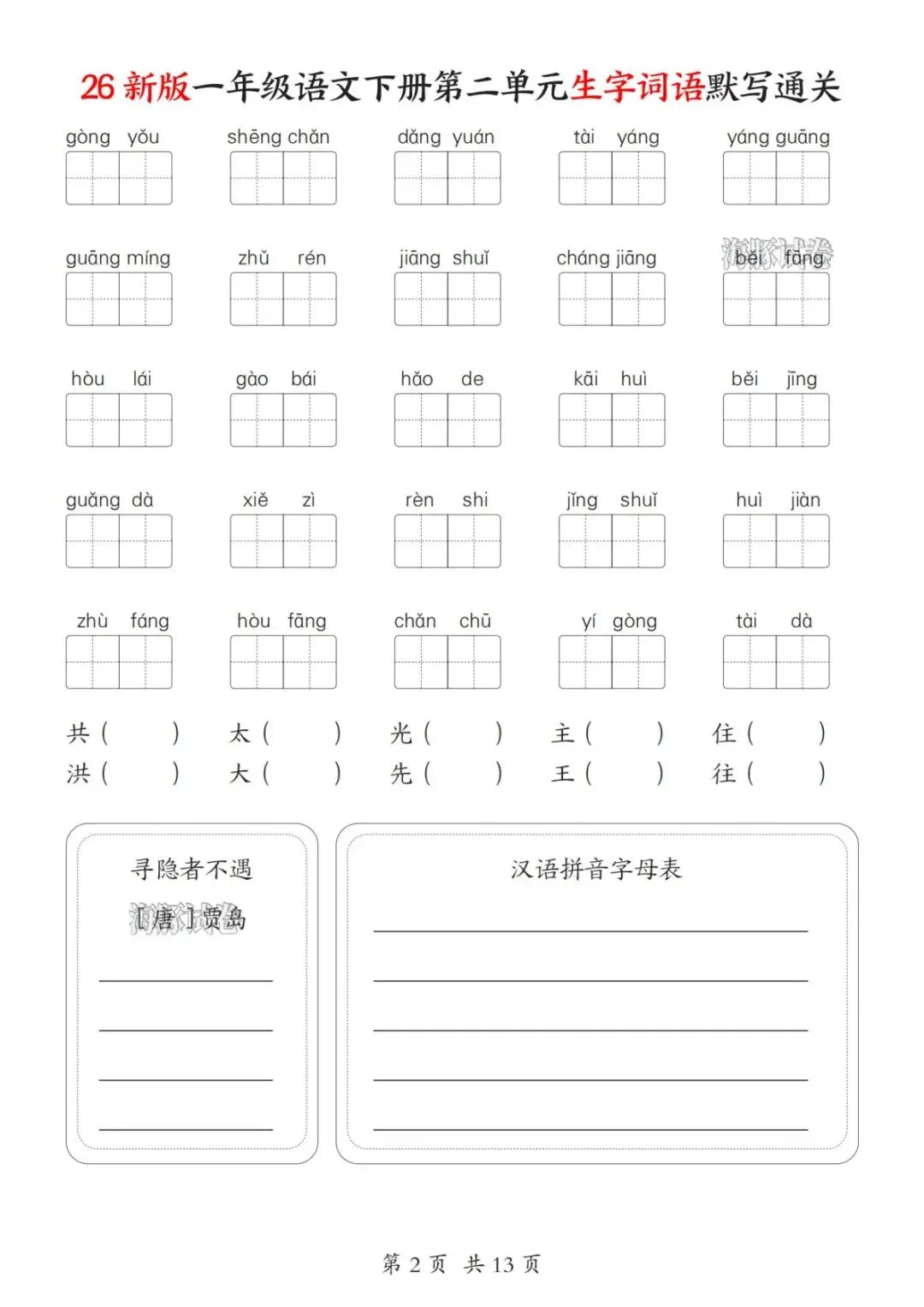 【海豚试卷】一年级(下)语文1-8生字词语默写通关(可收藏打印)