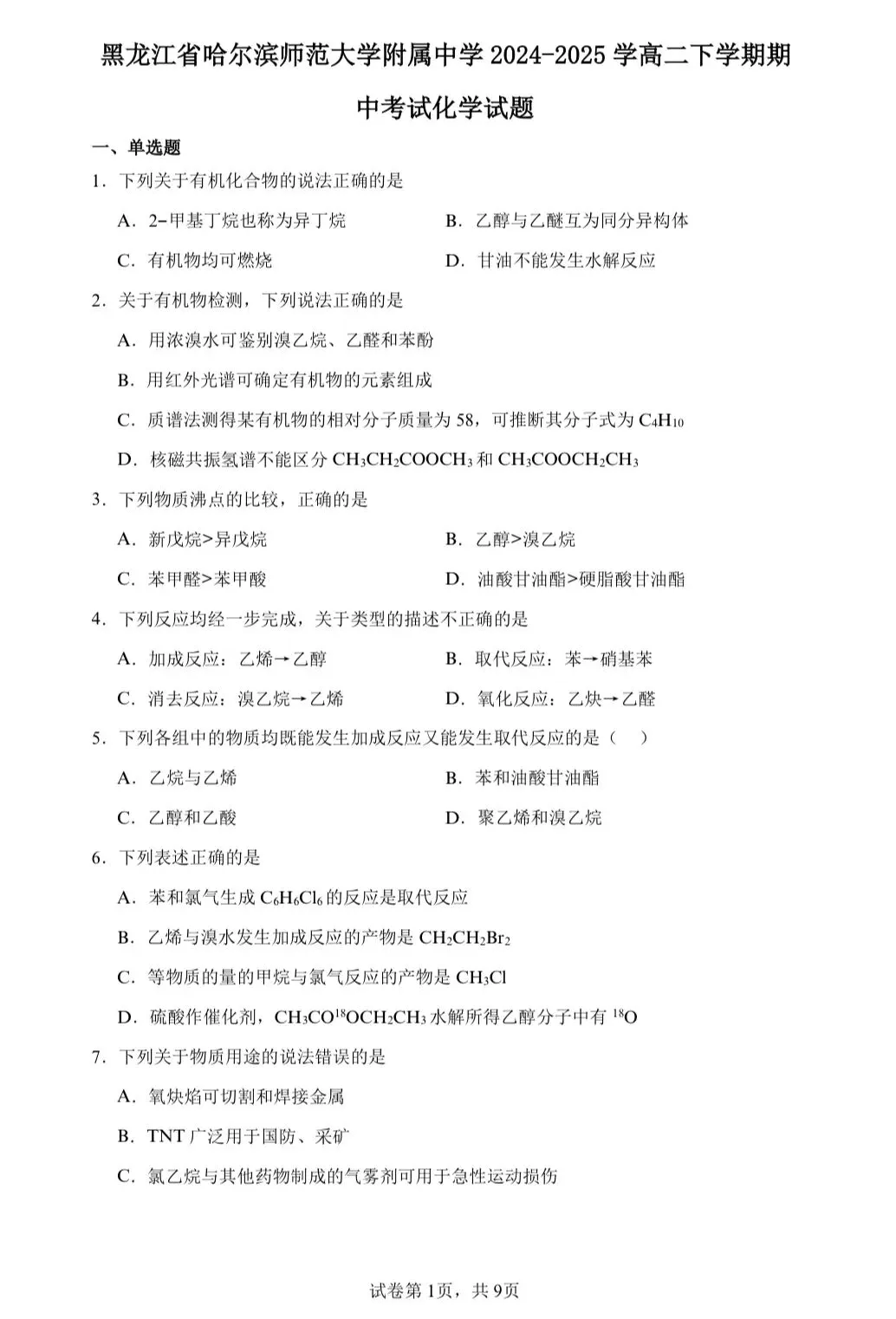 4.黑龙江省哈尔滨市第九中学校2024-2025学年高二下学期期中考试化学试题