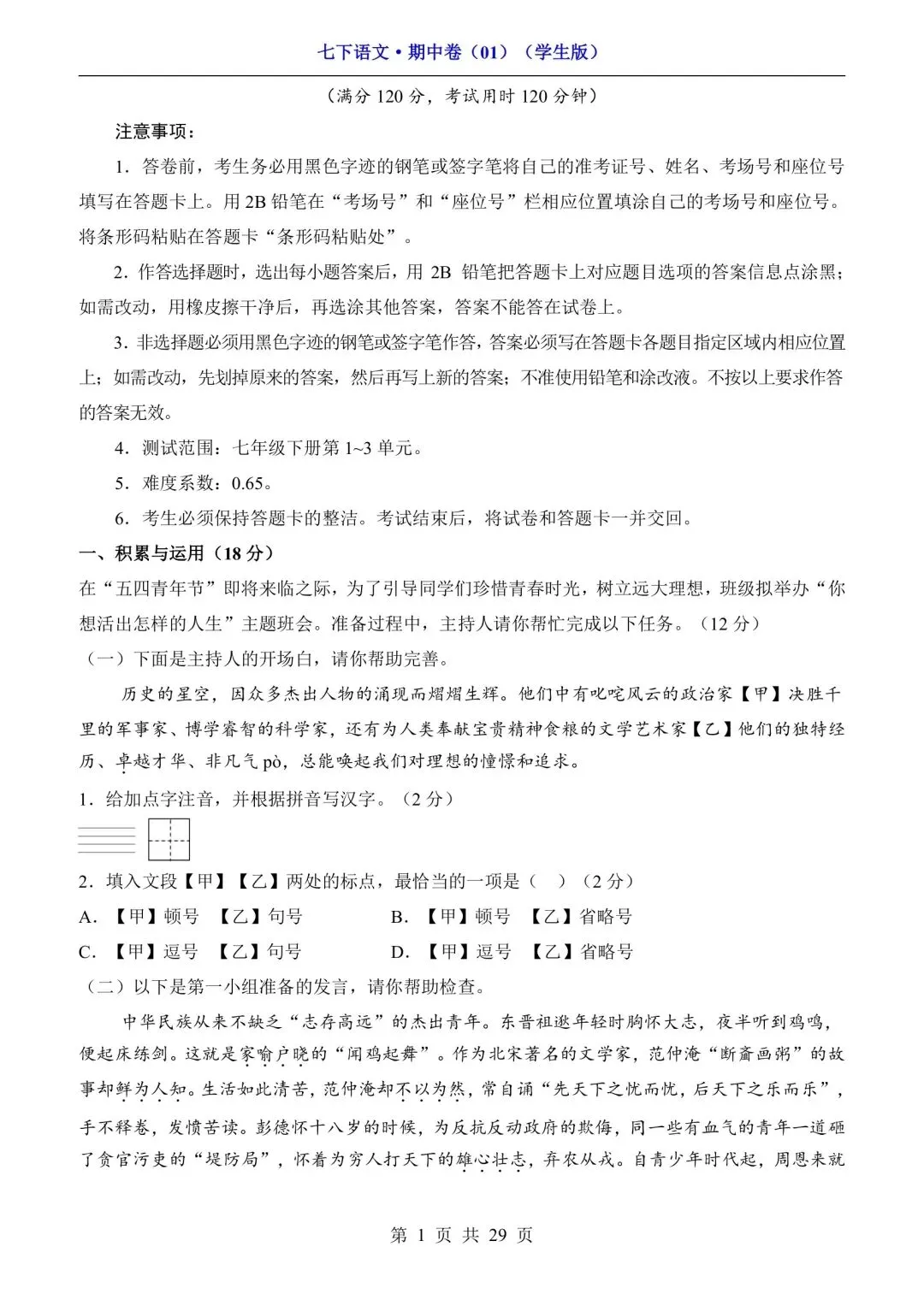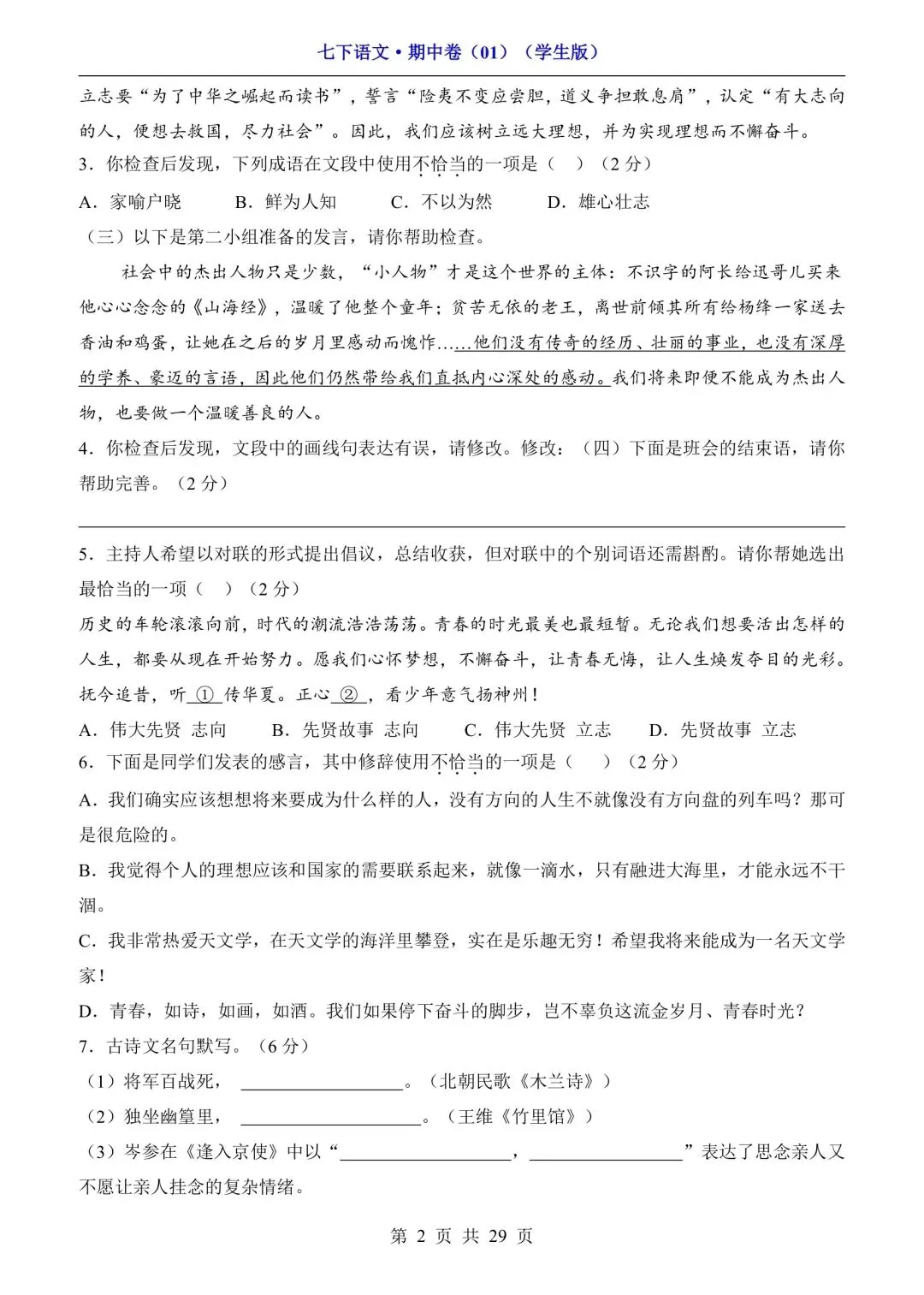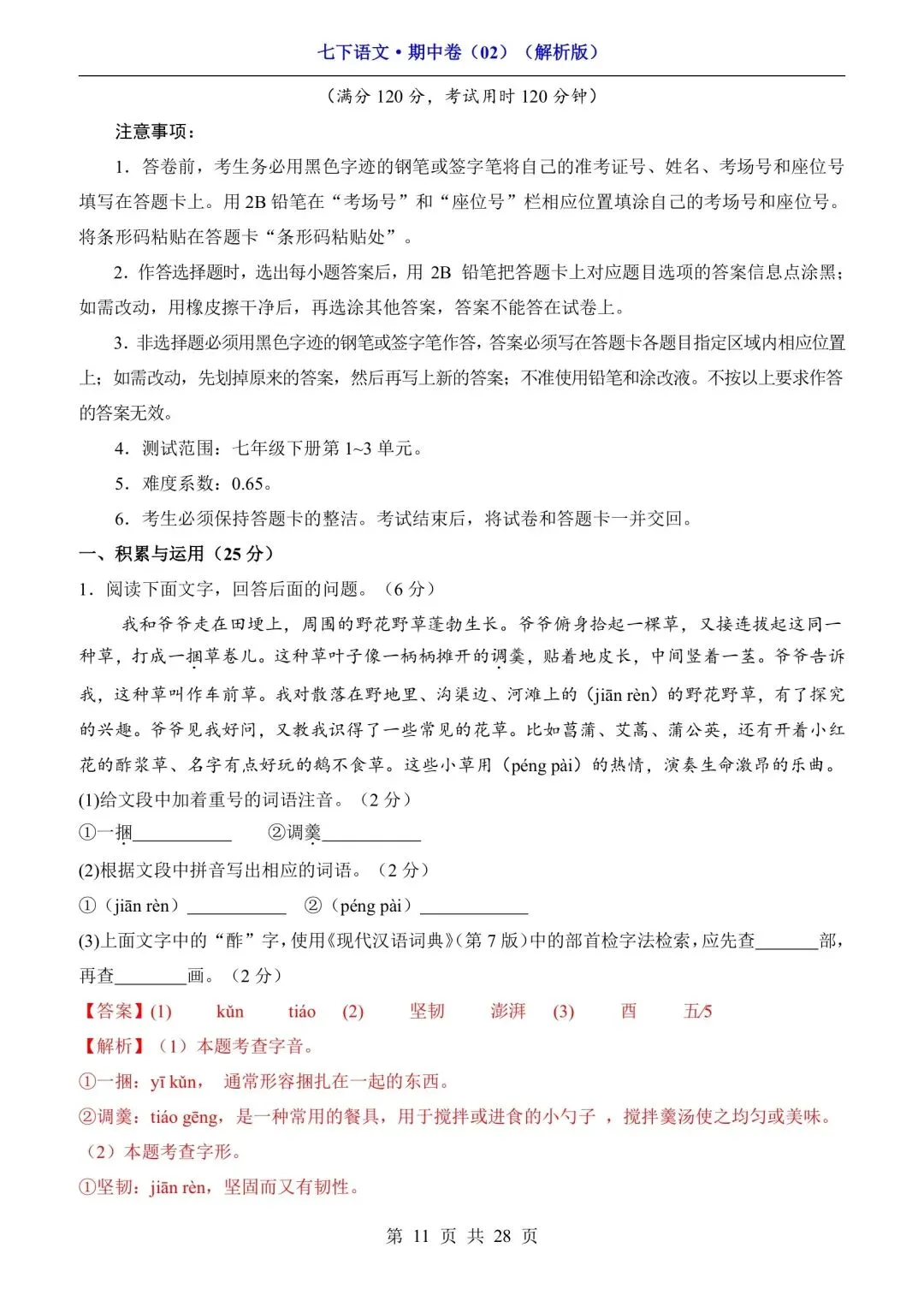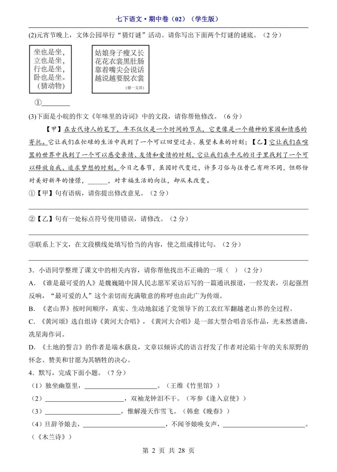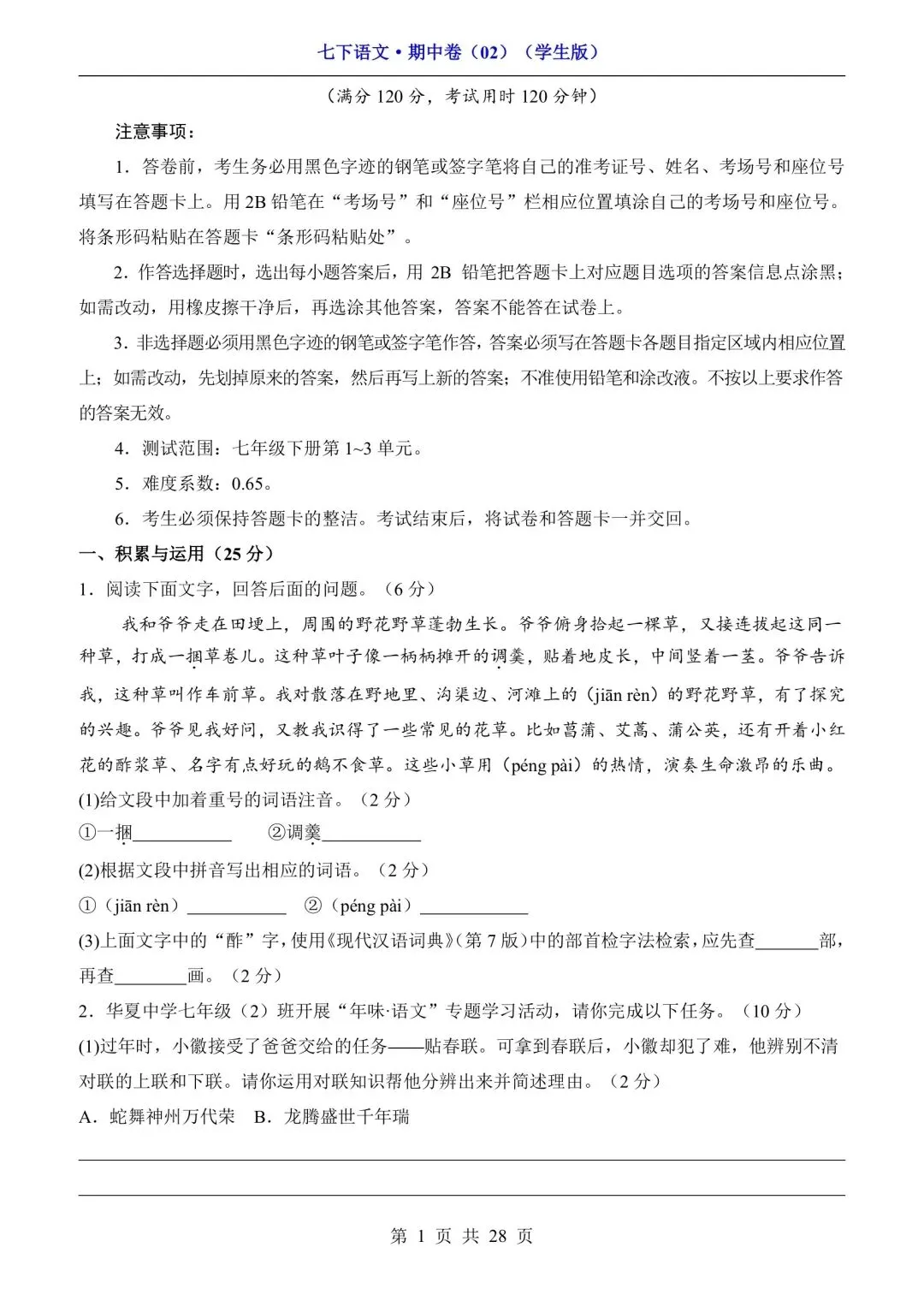 2026年春七年级下册人教版语文《期中考试真题测试卷》(考查1-3单元)(共2套,含答案解析),完整电子版可打印