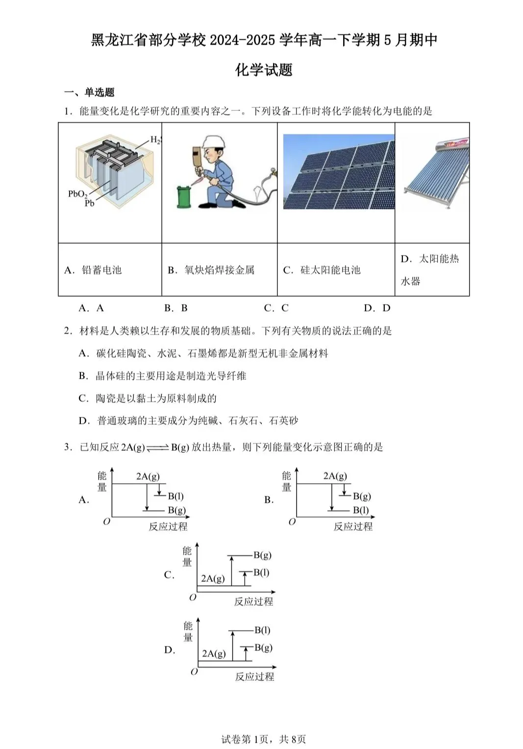 黑龙江省部分学校2024-2025学年高一下学期5月期中化学试题