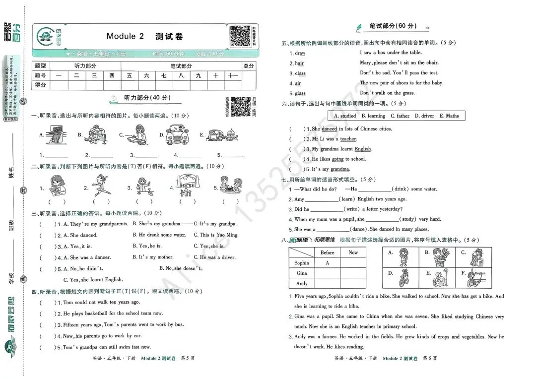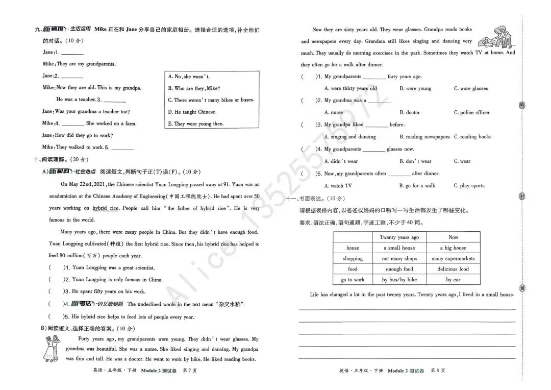Hello,大家好,我是教英语的Alice陈老师,2026外研社英语三起五下unit2 综合素养测评。试卷+讲解视频如下: