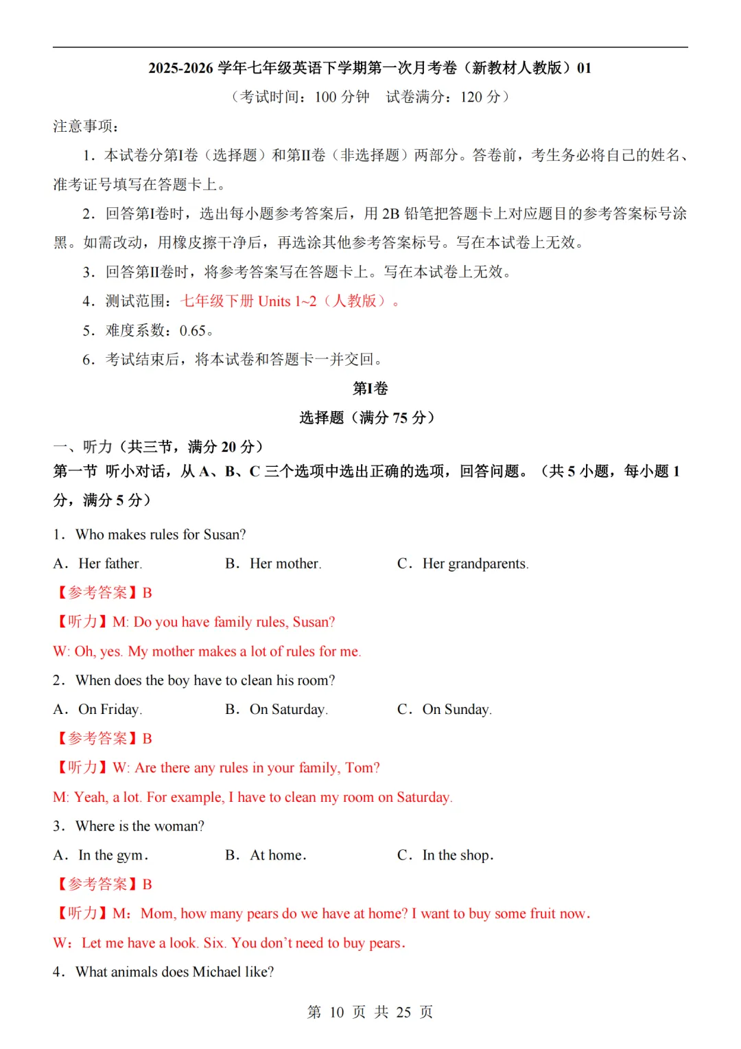 >人教版七年级下册英语第1次月考试卷01(原卷+解析+听力音频)