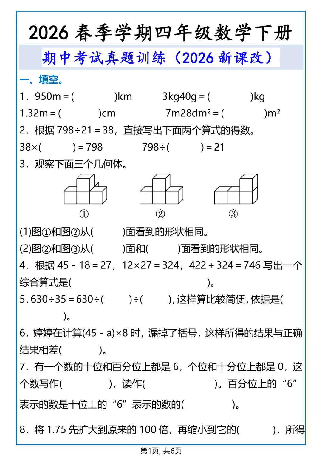 【免费下载】2026春新版四年级(下)数学 期中考试真题,可打印,PDF电子版