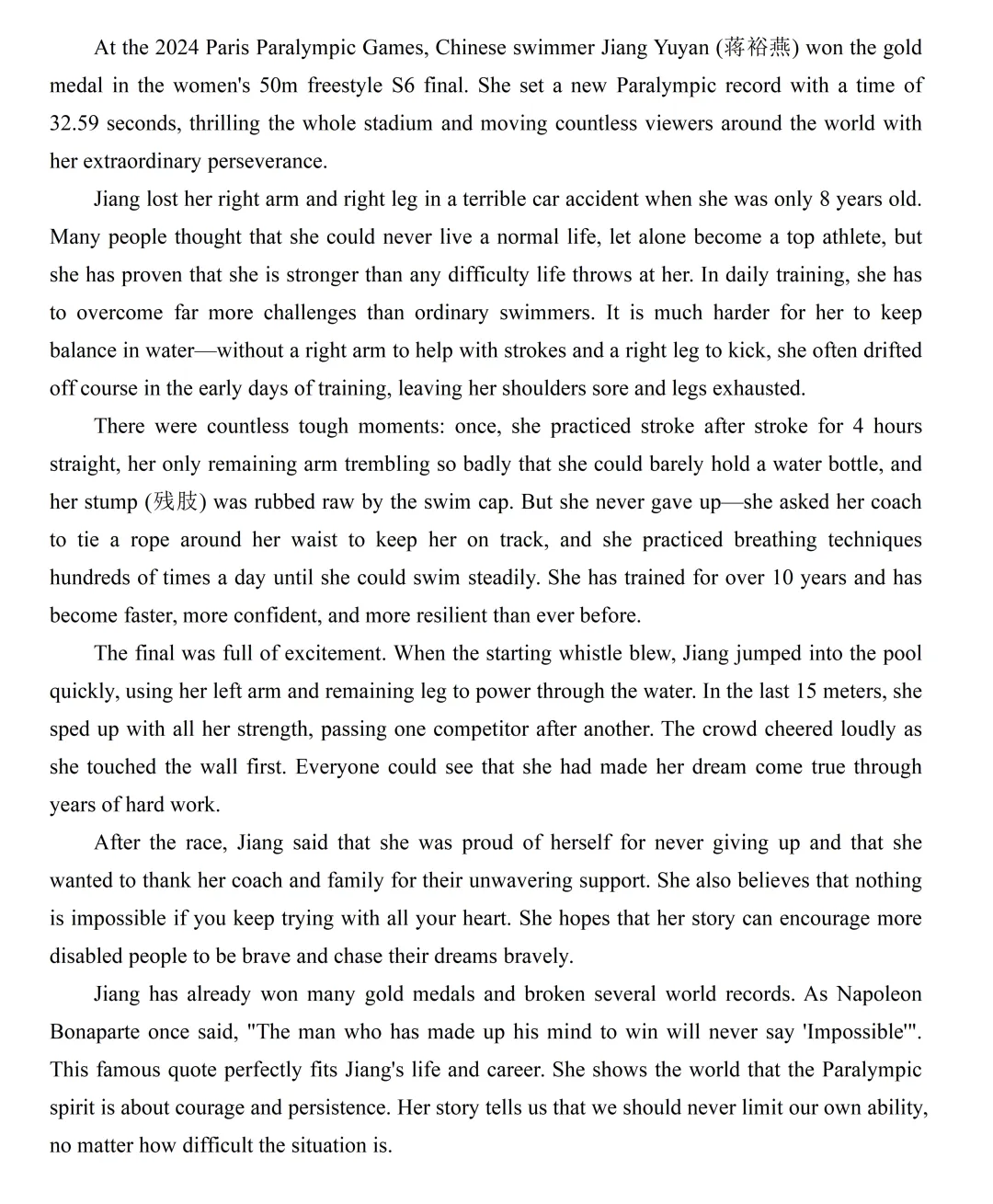 文章要点: 详细描述了蒋裕燕在50米自由泳S6决赛中以 32.59秒 打破残奥会纪录的壮举,以及她由于只有一侧身体有力量,必须在水中付出比常人更多的努力来保持平衡(stay afloat)。