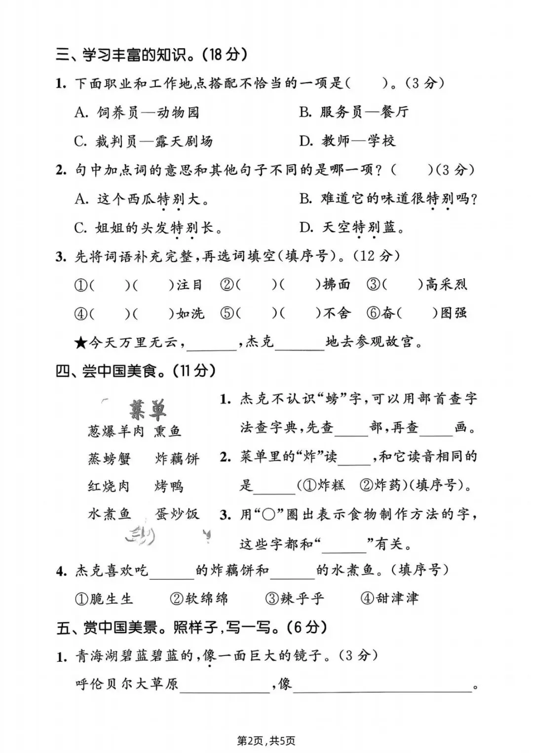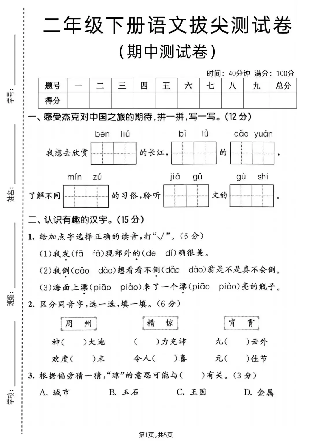 二年级语文下册期中试卷