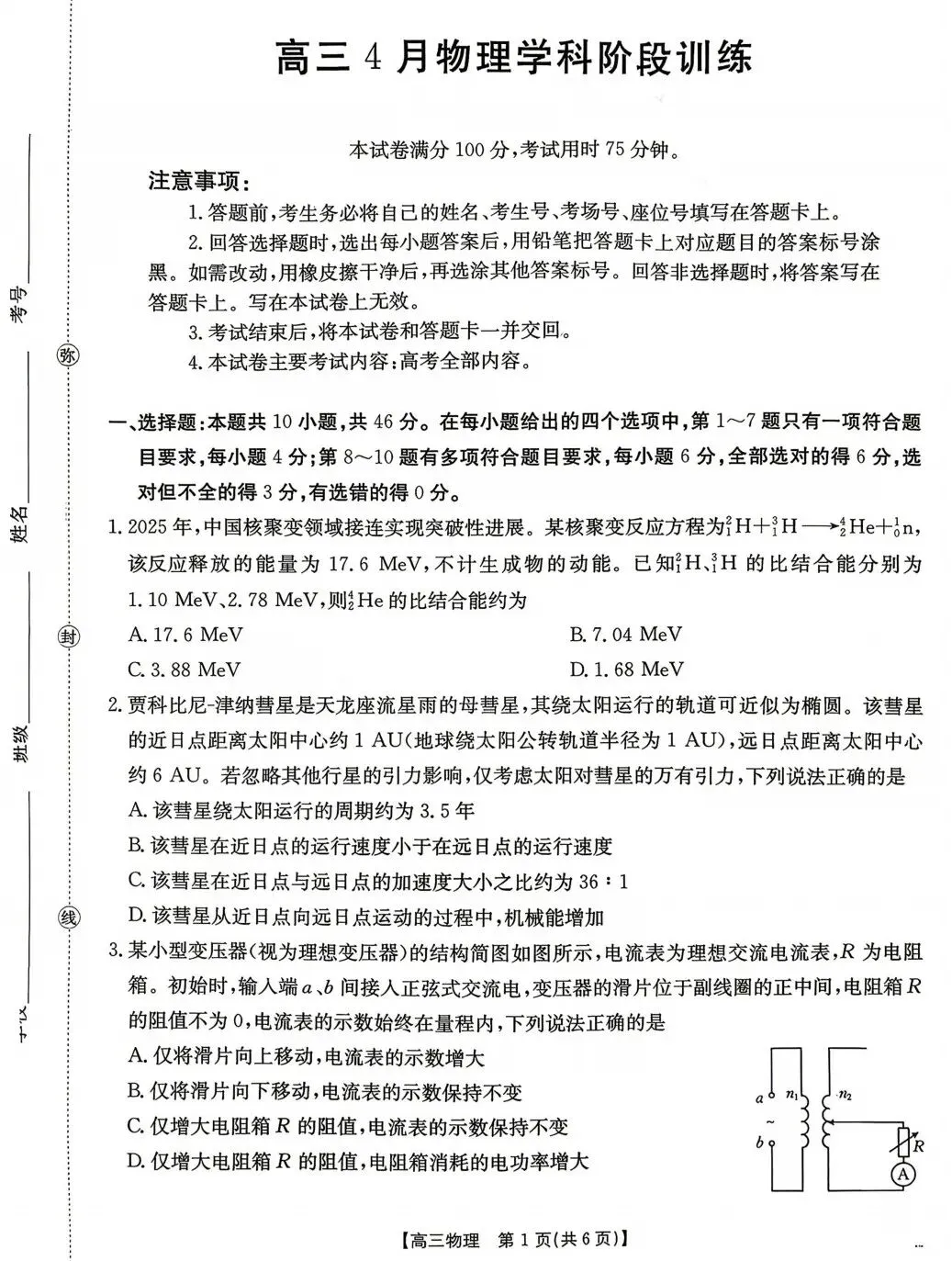 高中物理最新试题2026年4月11日