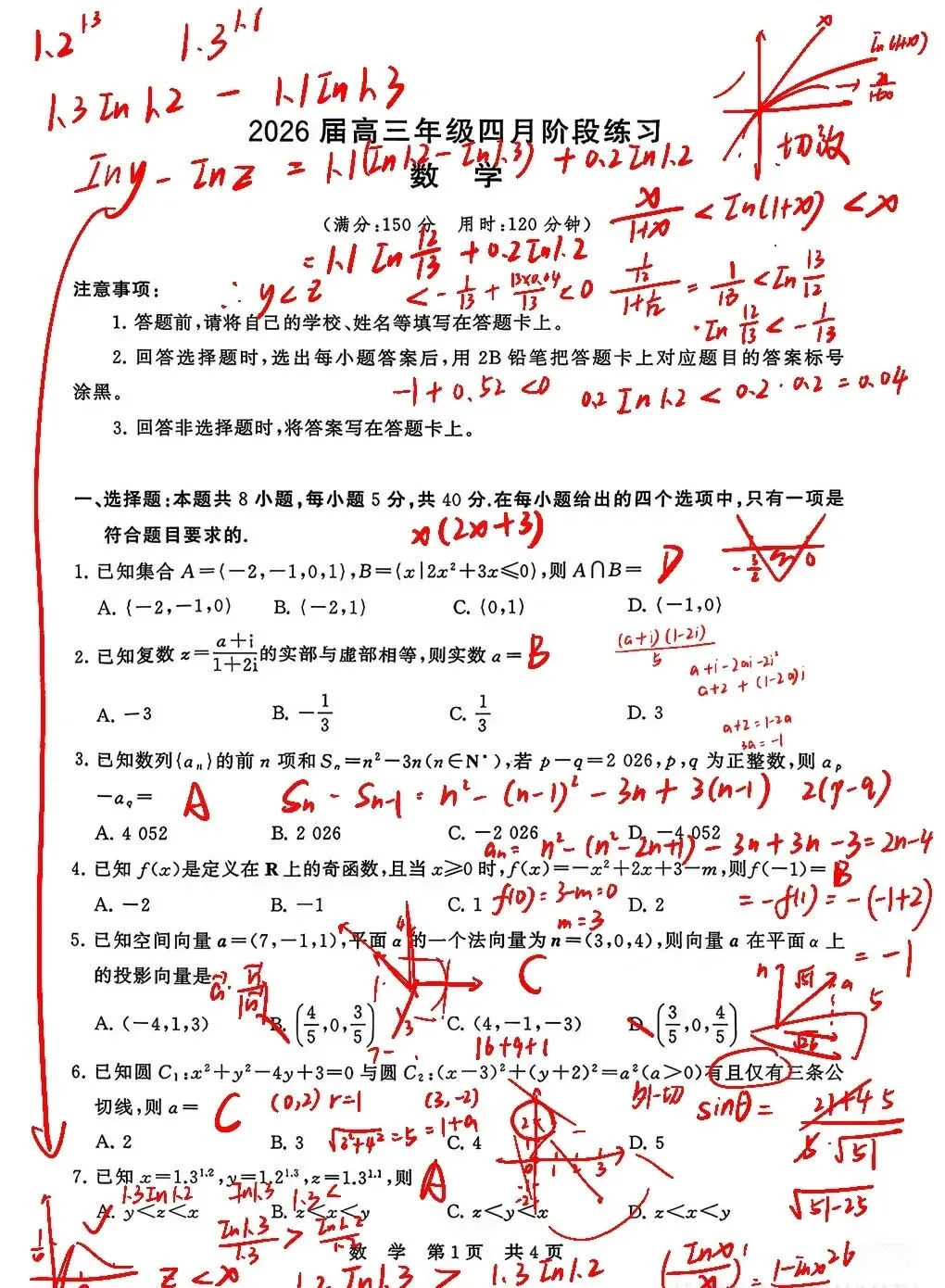 江西八校26届高三4月联考试数学试卷