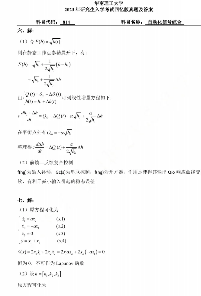 2003-2025年华南理工大学814自动化信号综合考研真题参考答案【不含19】