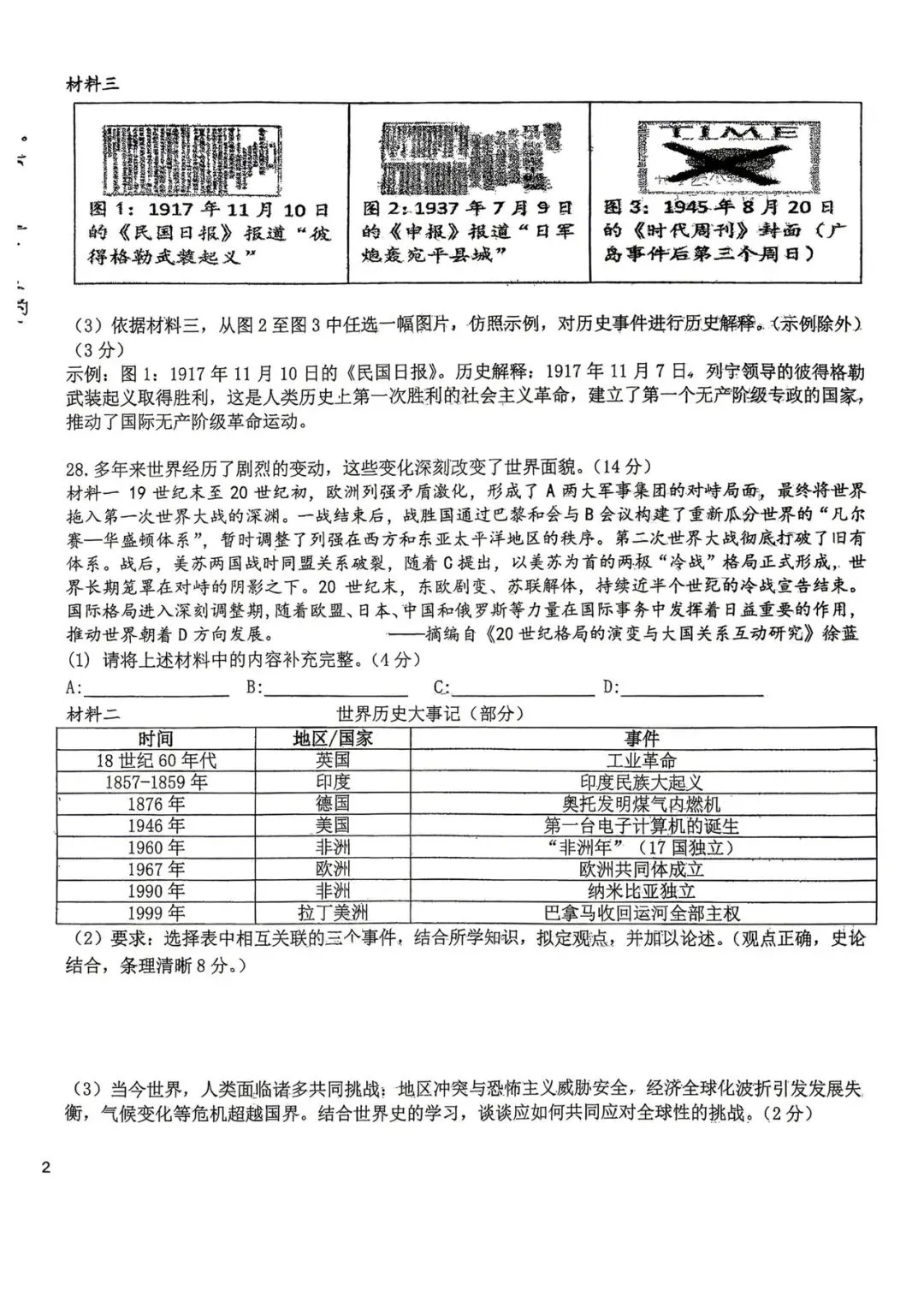 图3:1945年8月20日《时代周刊》。历史解释:1945年8月,美国向日本广岛投放原子弹,加速了日本法西斯的投降和二战的结束。(3分)