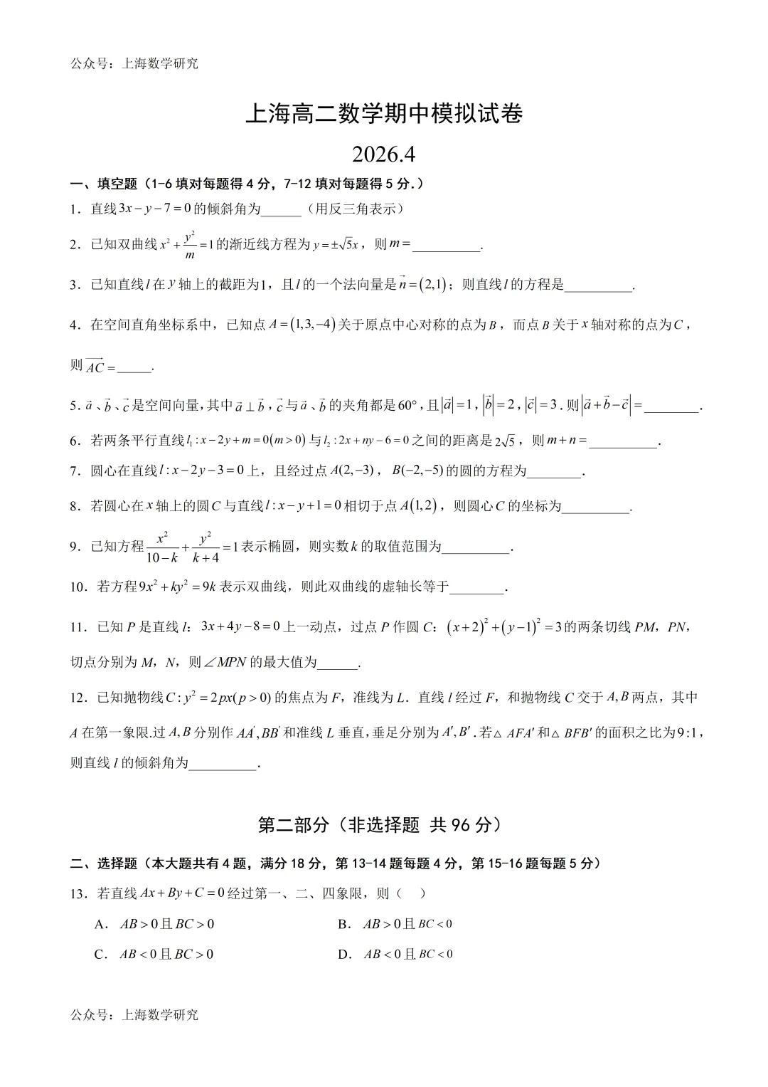 >上海高二数学期中模拟试卷及答案(2026.4)