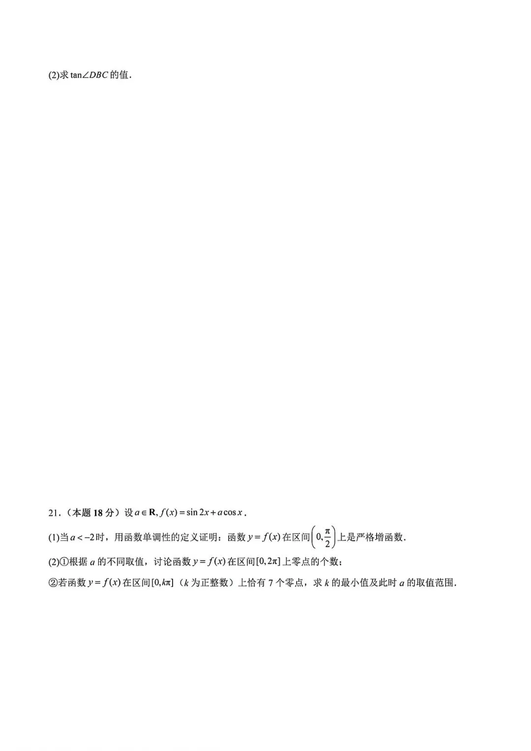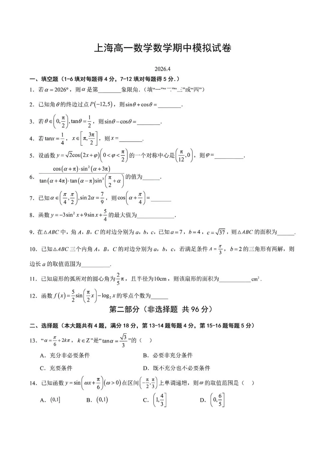 上海市高一第二学期数学期中模拟试卷及答案(2026.4)