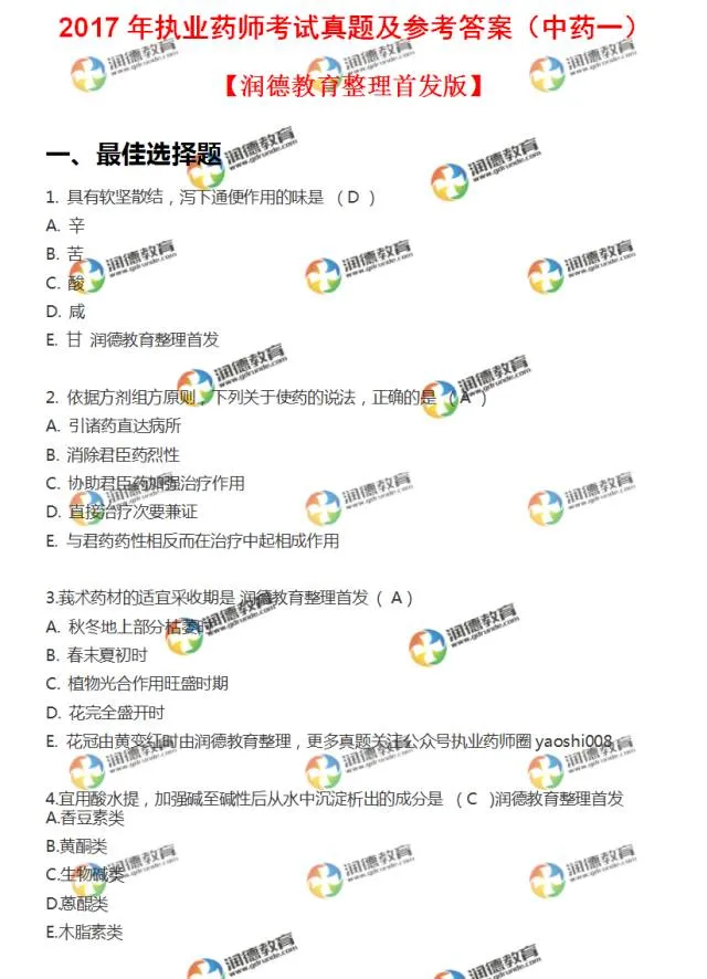 2017年执业药师考试真题+答案,润德教育全网首发!连续3年全网首发真题答案,继续引领行业奇迹 !