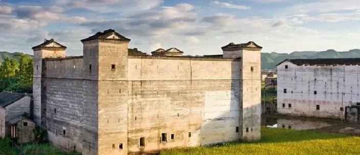 广东河源林寨古村的四角楼是典型的客家围屋,因其建筑的四个角各有一个阁楼而得名,具有防洪防盗功能。林寨四角楼的建筑材料皆就地取材,房屋由生土夯筑,用卵石和糯米汁等层层垒叠而成。下图为林寨四角楼景观图。据此完成下面小题。