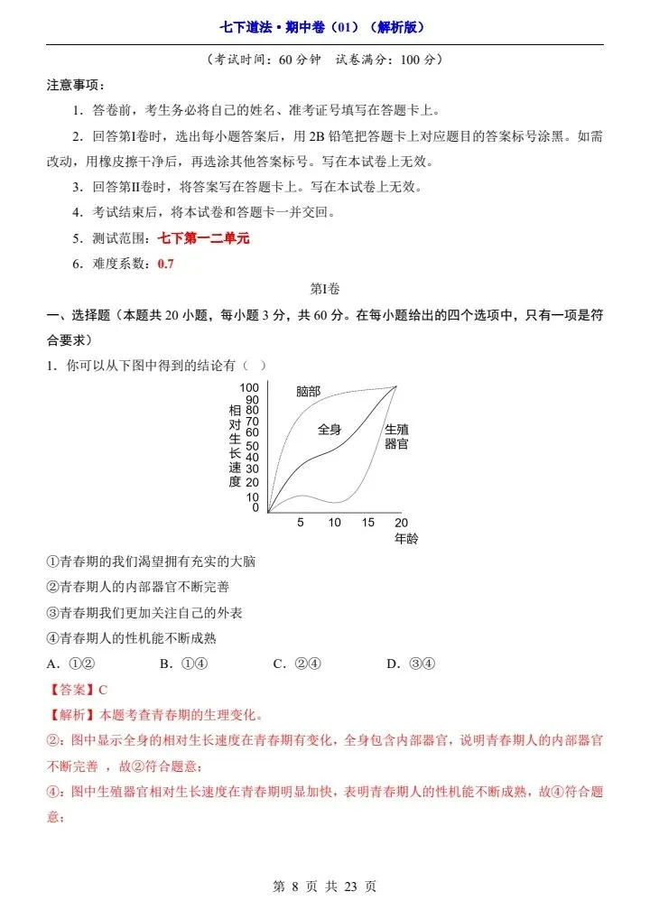 2026年春七年级下册道法《期中模拟试卷》附详细解析版,完整电子版可打印!