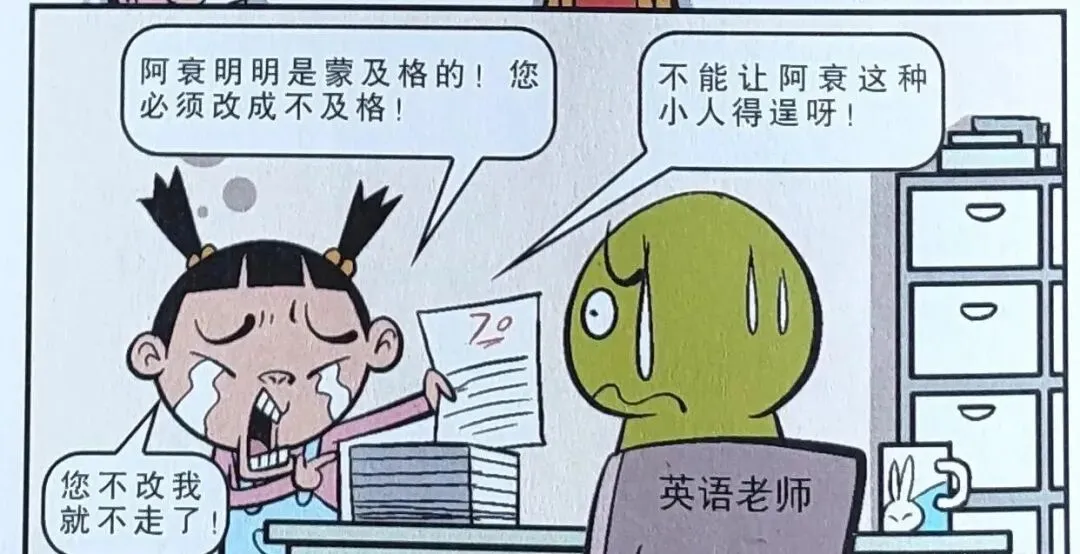 在衰漫画的故事中,小衰经历了数次考试失利,终于在这一次考试中获得了及格的成绩,小衰拿着试卷喜极而泣,可这份喜悦却没持续太久,同桌脸姐有些不相信小衰能及格,于是检查了一番,结果发现是老师判错了,于是义正言辞地冲向了办公室,在老师面前打闹了一场,力求老师保持公平,小衰的成绩必须改回来,毕竟如果小衰及格了,对于其他认真学习的同学不公平,最后老师也是为了考试公平,把小衰的试卷改了回来,小衰的成绩也从及格变成了不及格,希望小衰努力学习,争取在下次考试中及格。