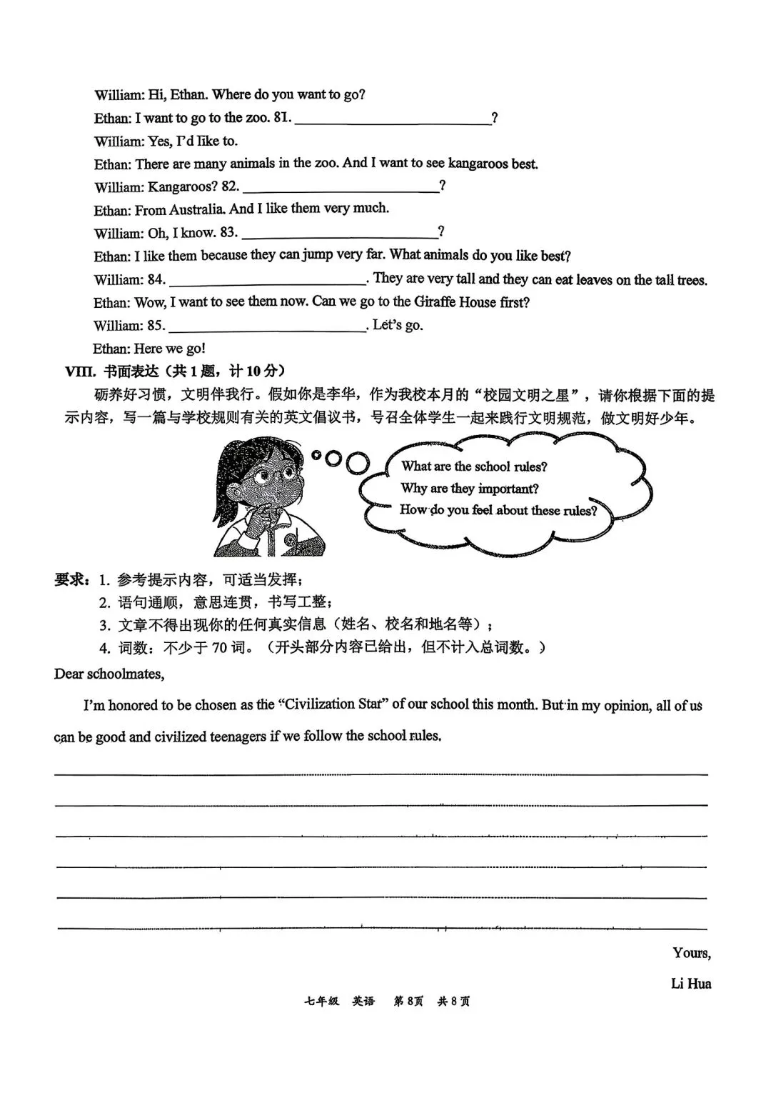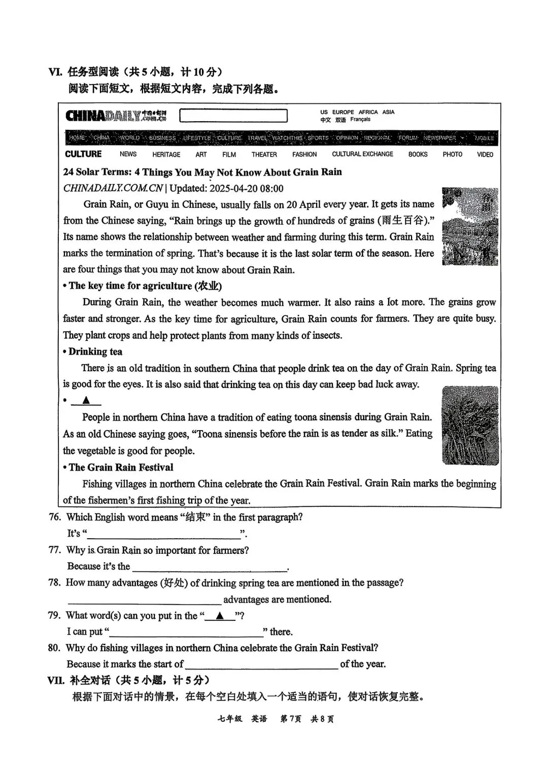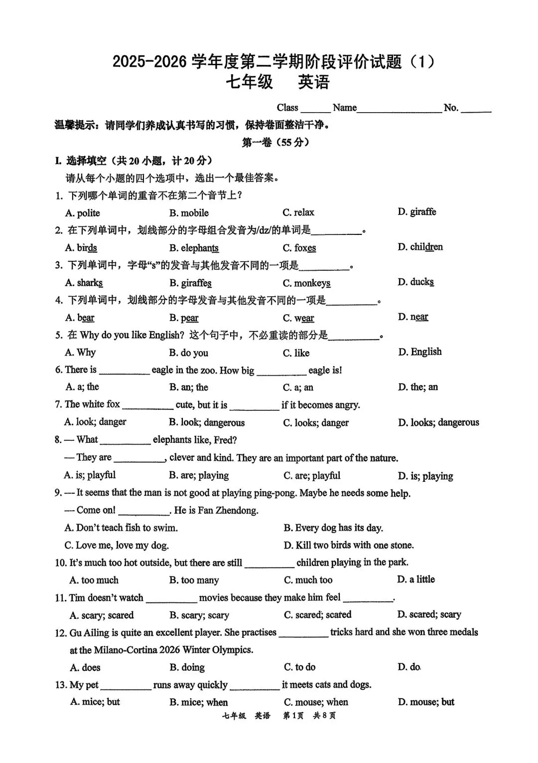 高新一中七下第一次月考官方答案(语文、英语)