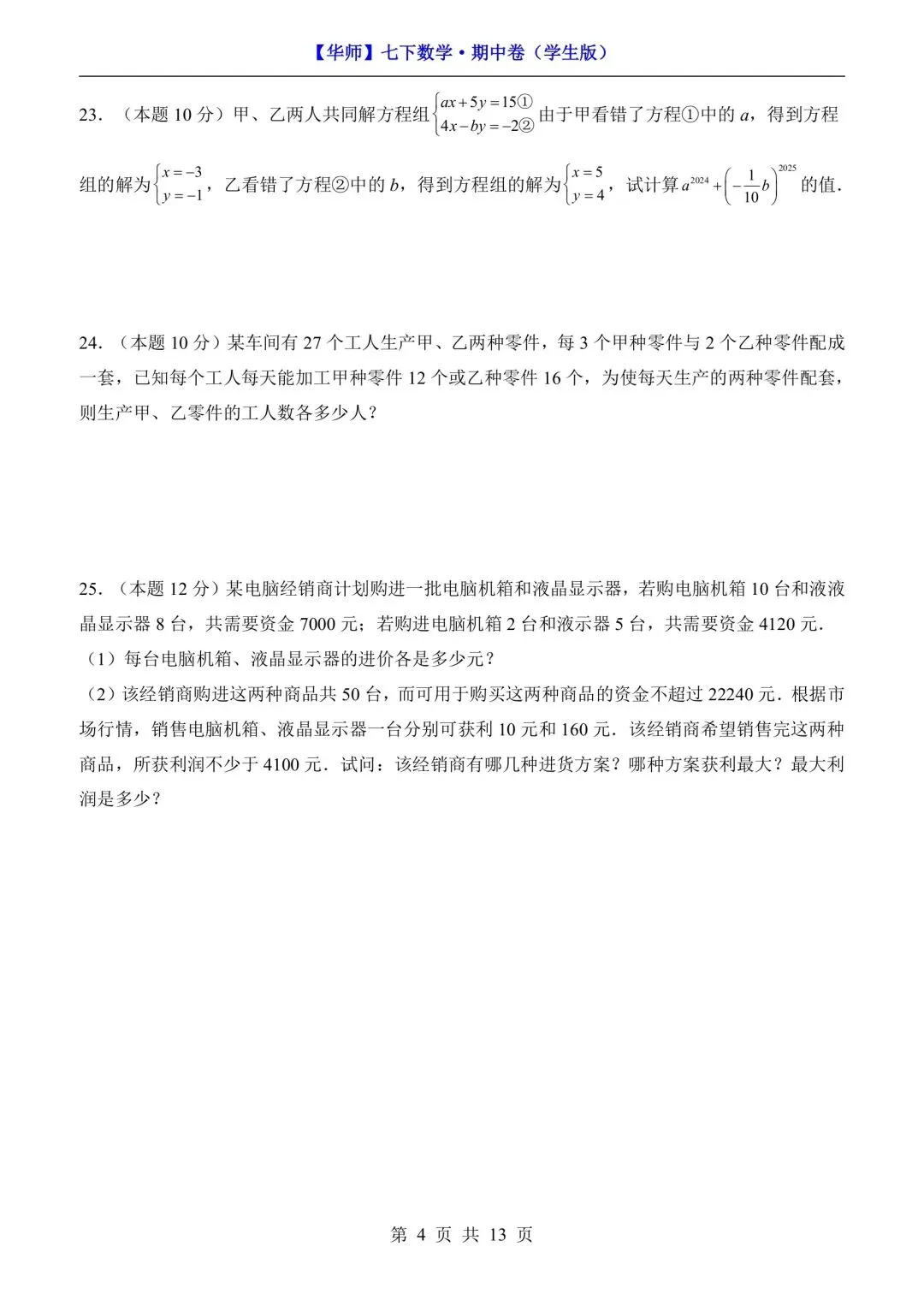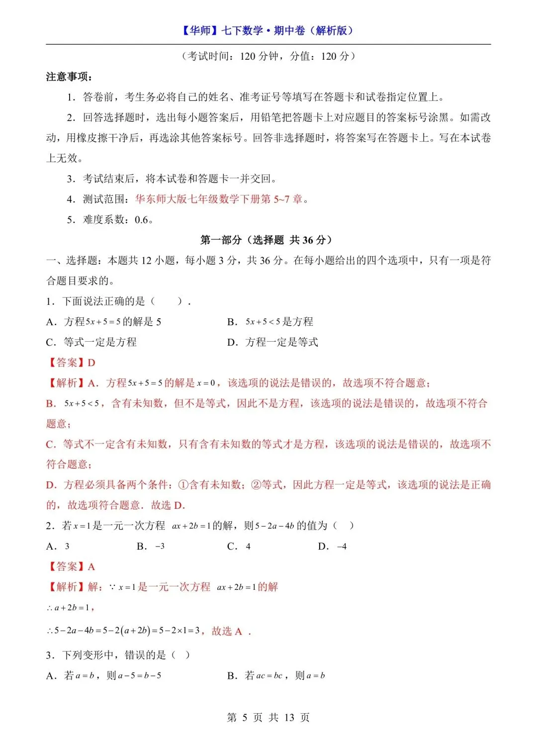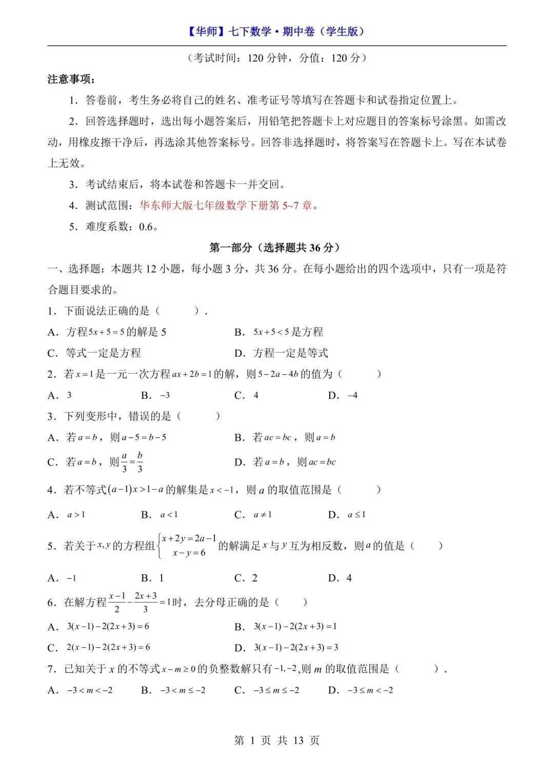 新版初一七年级下册华师版数学期中试卷练习含答案可打印