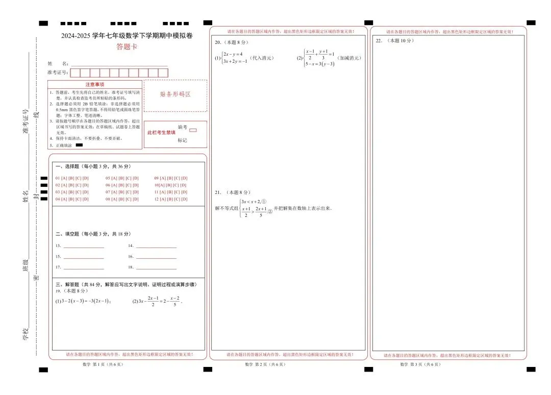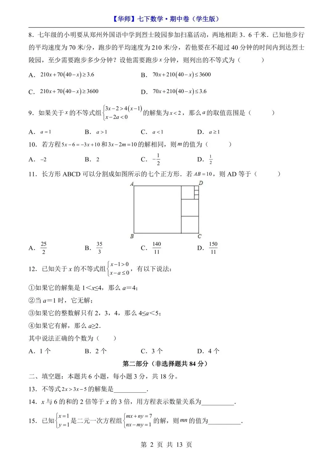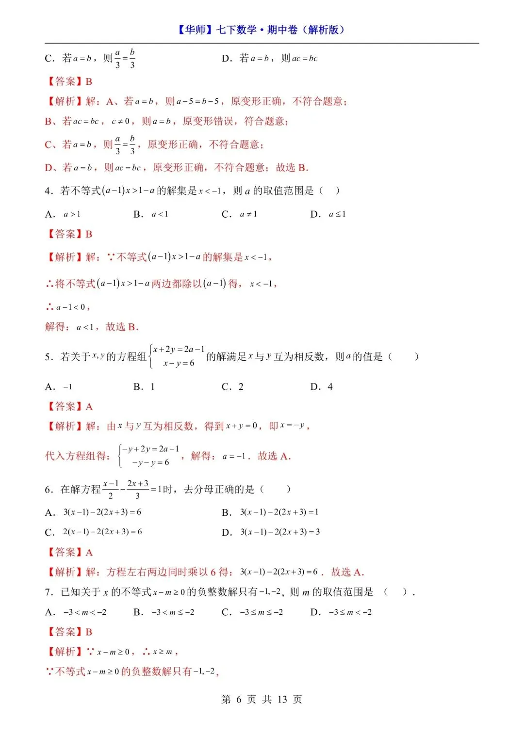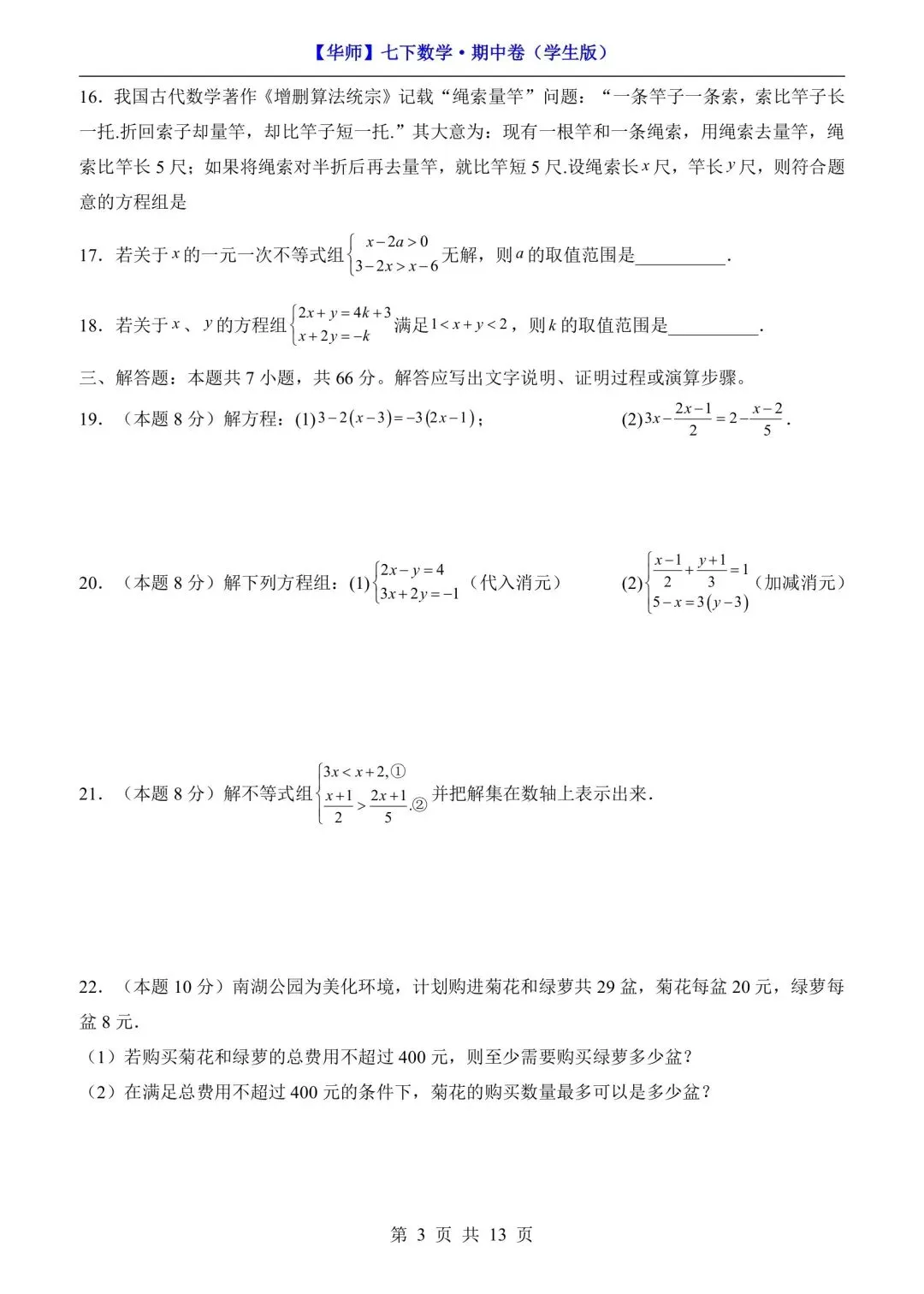 新版初一七年级下册华师版数学期中试卷练习含答案可打印