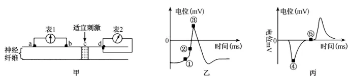 B、表1的a、b接线柱都接在膜外侧,当电流流经两接线柱时,指针偏转方向相反,因此图甲中的表1记录的是图丙所示的电位变化曲线。电流流经b柱时指针发生一次偏转,流经a柱时指针又发生一次偏转,共发生2次方向相反的偏转,B错误;