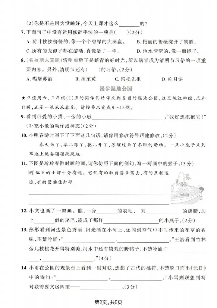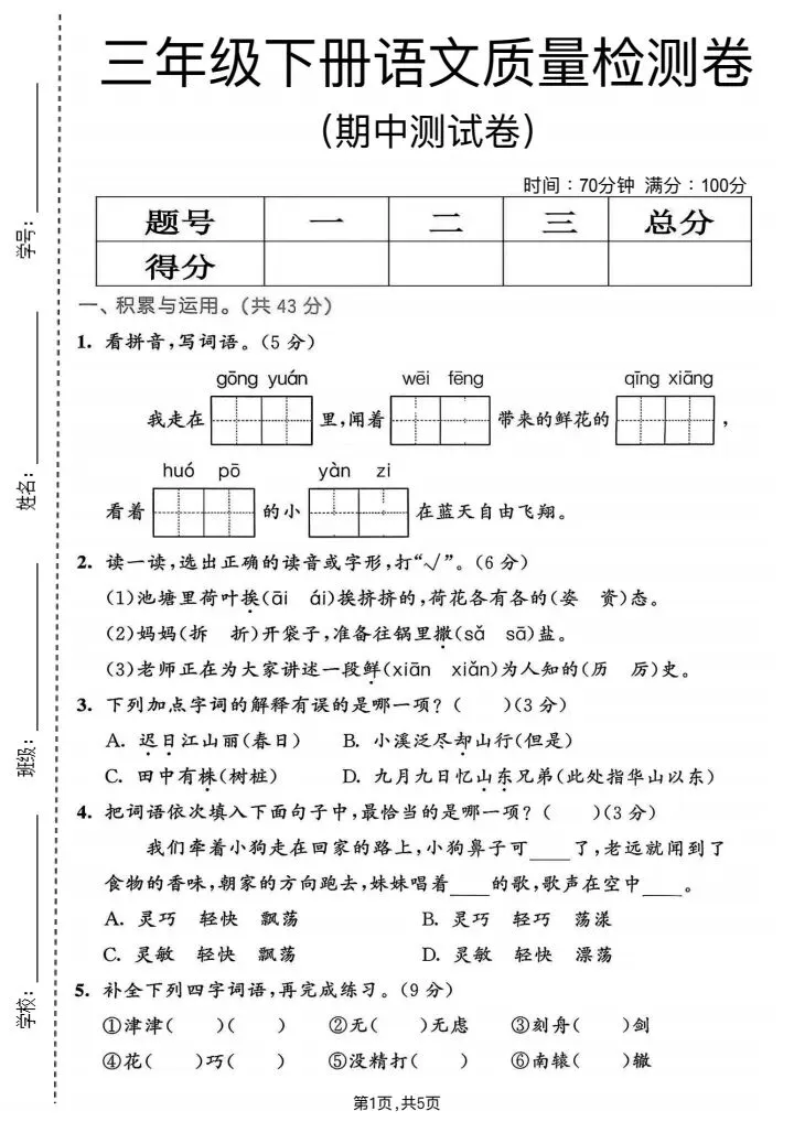 2026春《三年级下册语文期中达标检测试卷(共5套)》电子版可打印,期中综合测评