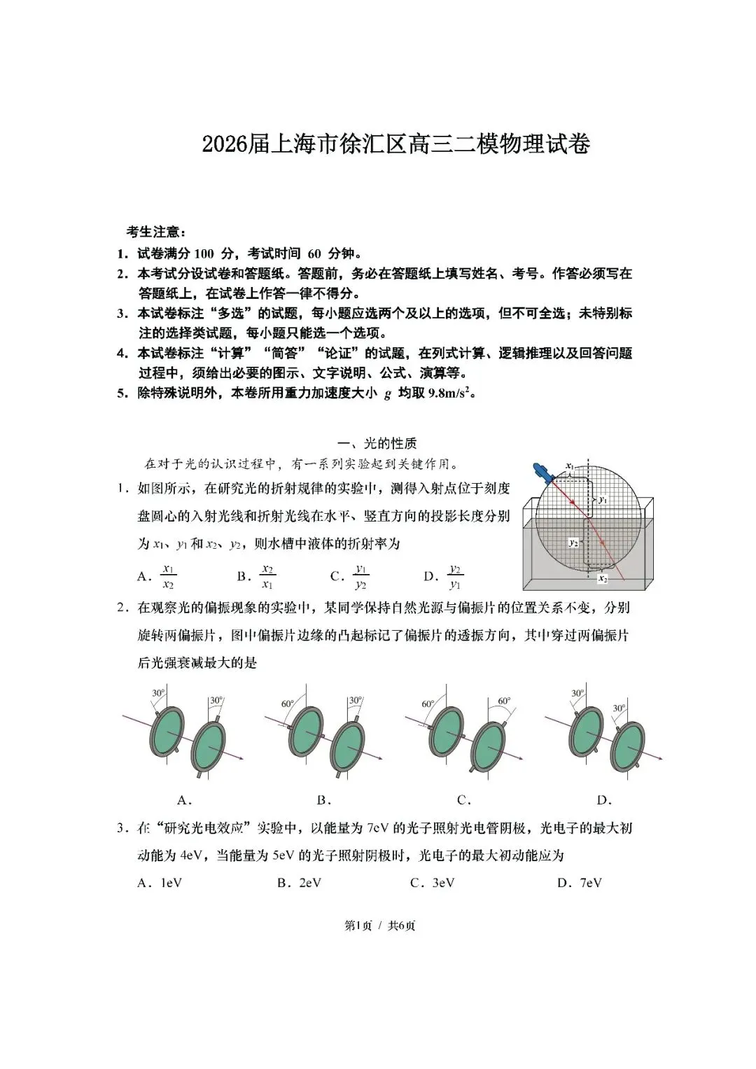 >2026届上海市徐汇区高三二模物理试卷(含答案)