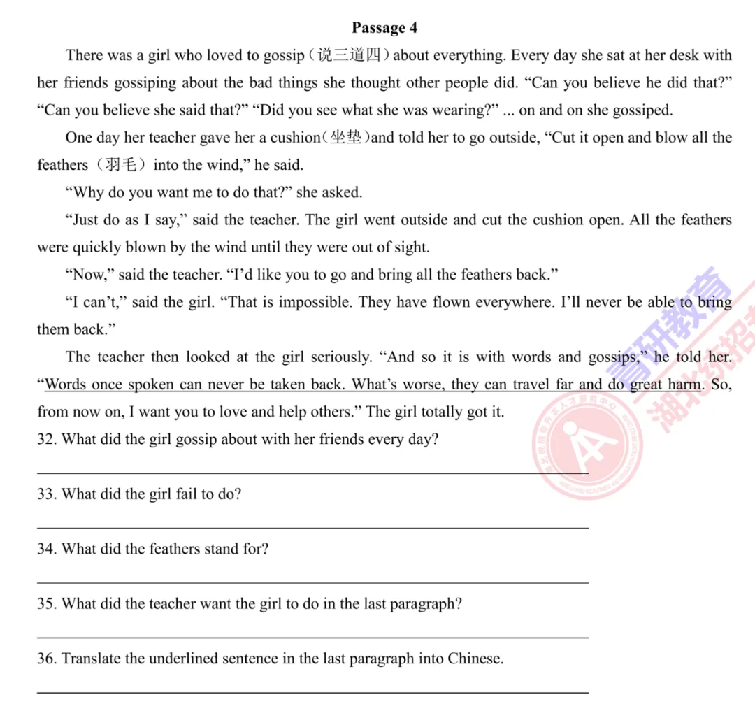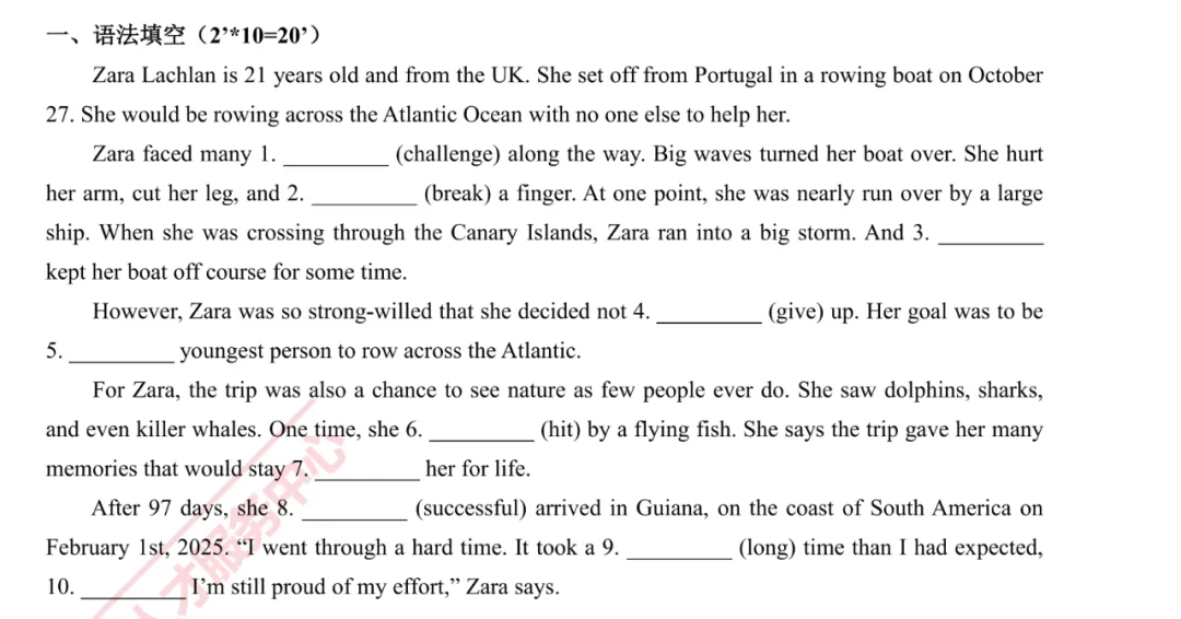 很多考生容易在被动语态、词性转换、非谓语上丢分,比如第6题she ____ (hit) by a flying fish,需要用被动语态was hit,很多同学会漏写be动词。