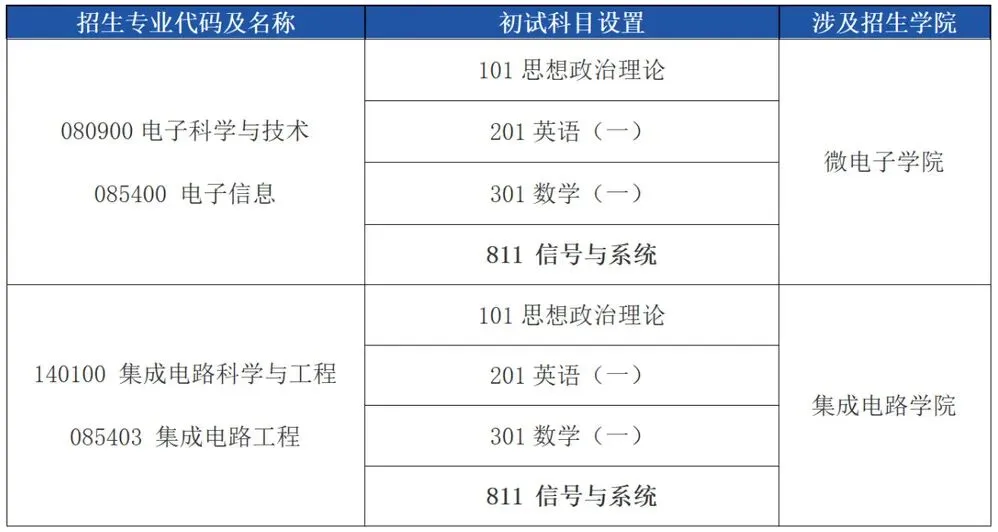 2026年硕士研究生招生专业目录中,微电子学院和集成电路学院的初试自命题科目将予以调整,具体科目设置调整结果如下: