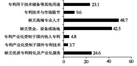 首先,根据图中信息可知,选择比例越高说明该制约因素对专利产业化的阻碍越严重。7类制约因素中,选择“缺少高端人才”的比例最高,其次是“缺乏资金、设备或场地”,选择其他制约因素的比例最高不到25%。可判断,缺人才、缺资金、缺设备或场地是当前中国专利产业化过程中最主要的制约因素。