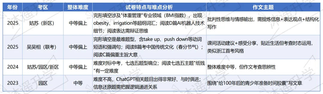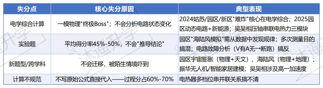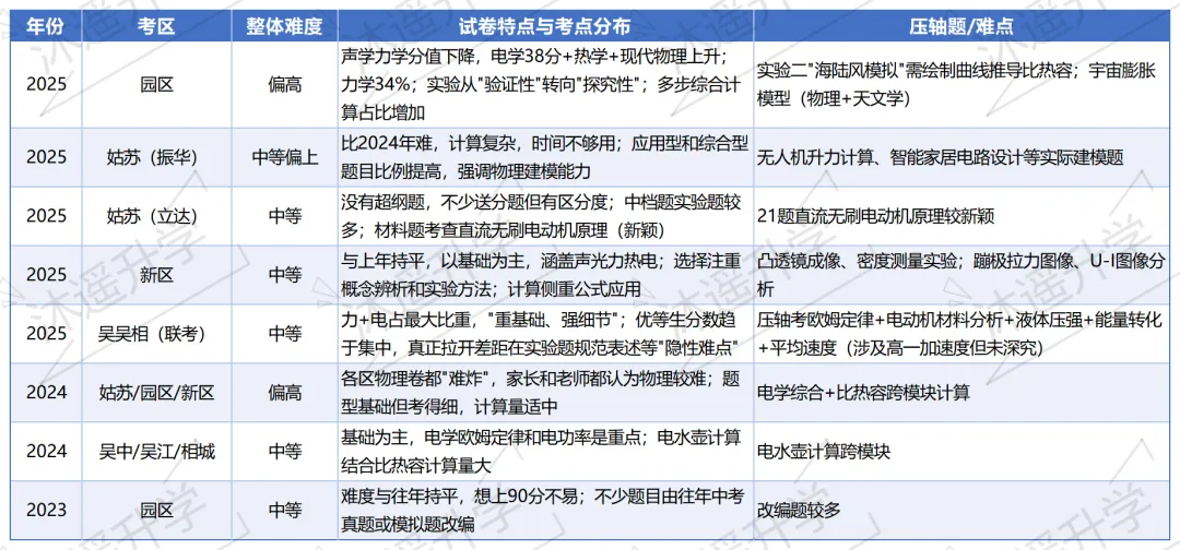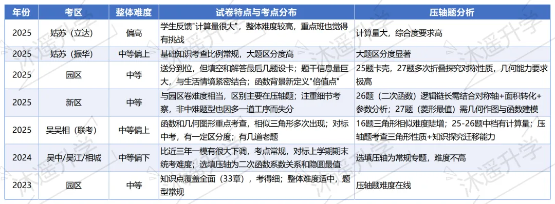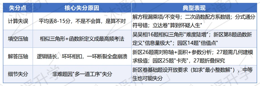 趋势一:一模数学难度波动大,但2025年全面回归"中考难度"。2024年吴吴相卷明显偏简单(家长反馈"比往年有很大下调"),但2025年各区卷普遍回到中等偏上水平,尤其姑苏立达"计算量算到怀疑人生"。2026年六区统考预计难度对标2025年水平。趋势二:函数+几何综合压轴是标配,相似三角形成为近两年最高频考查点。2025年吴吴相卷相似三角形"多次出现",16题填空压轴也是相似问题;新区卷27题菱形最值需函数建模。函数背景的新定义题型(如园区"倍值点"、新区坐标系新定义问题)成为选填压轴新宠。趋势三:题干信息量暴增,阅读理解能力成为隐性考点。2025年园区和新区的解答题题干"与生活情境结合得非常紧密",学生不仅需要数学能力,还需要快速提取和归纳信息的能力。中难题型也因"多一道工序"而失分。 |