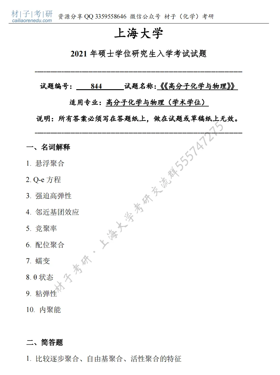 >【考研真题】2021年上海大学(844高分子化学与物理)真题公布