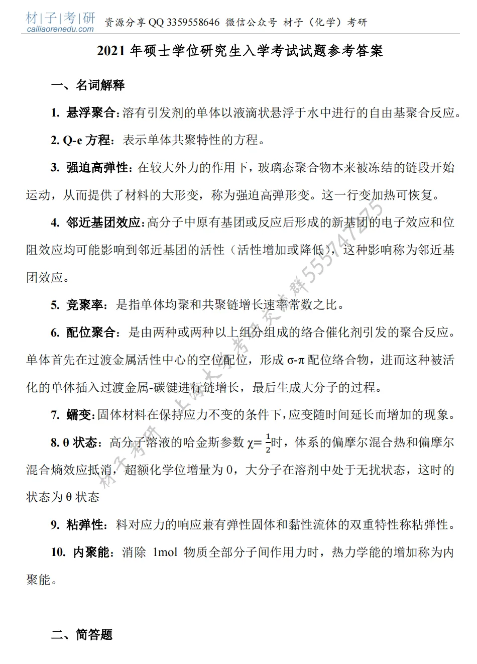 【考研真题】2021年上海大学(844高分子化学与物理)真题公布