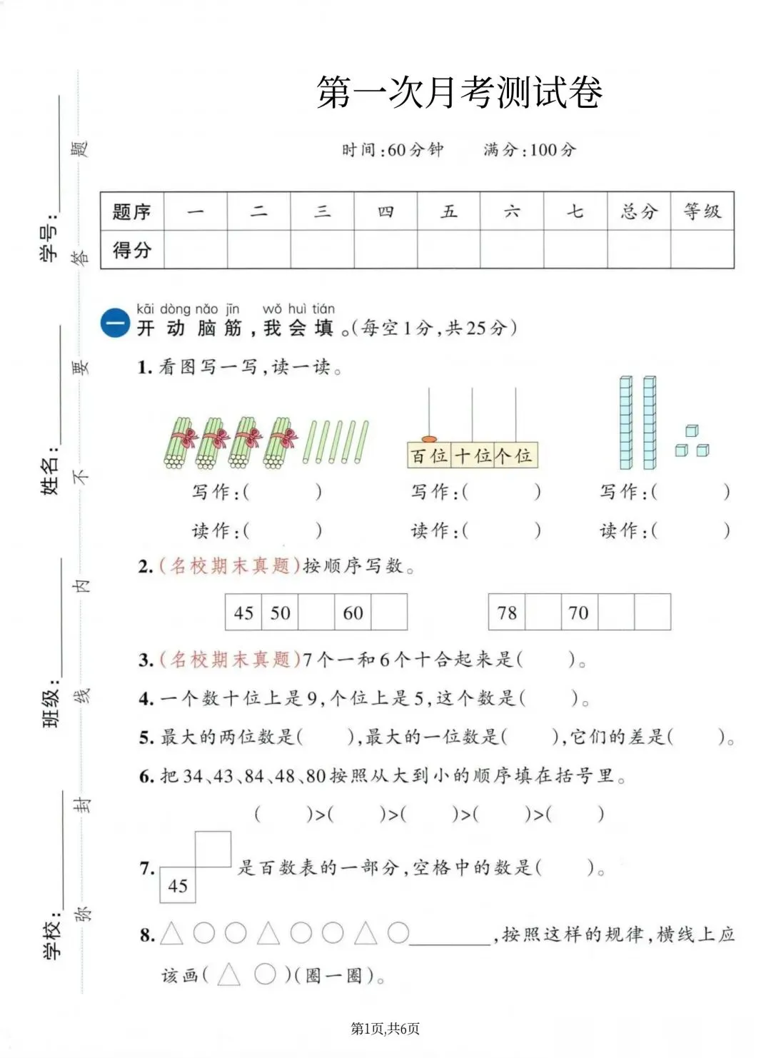 一年级下册第一次月考即将到来,特意整理了数学月考试卷及完整答案,题目贴合课本基础,适合孩子考前练习、查漏补缺,打印就能做,帮孩子轻松备考~