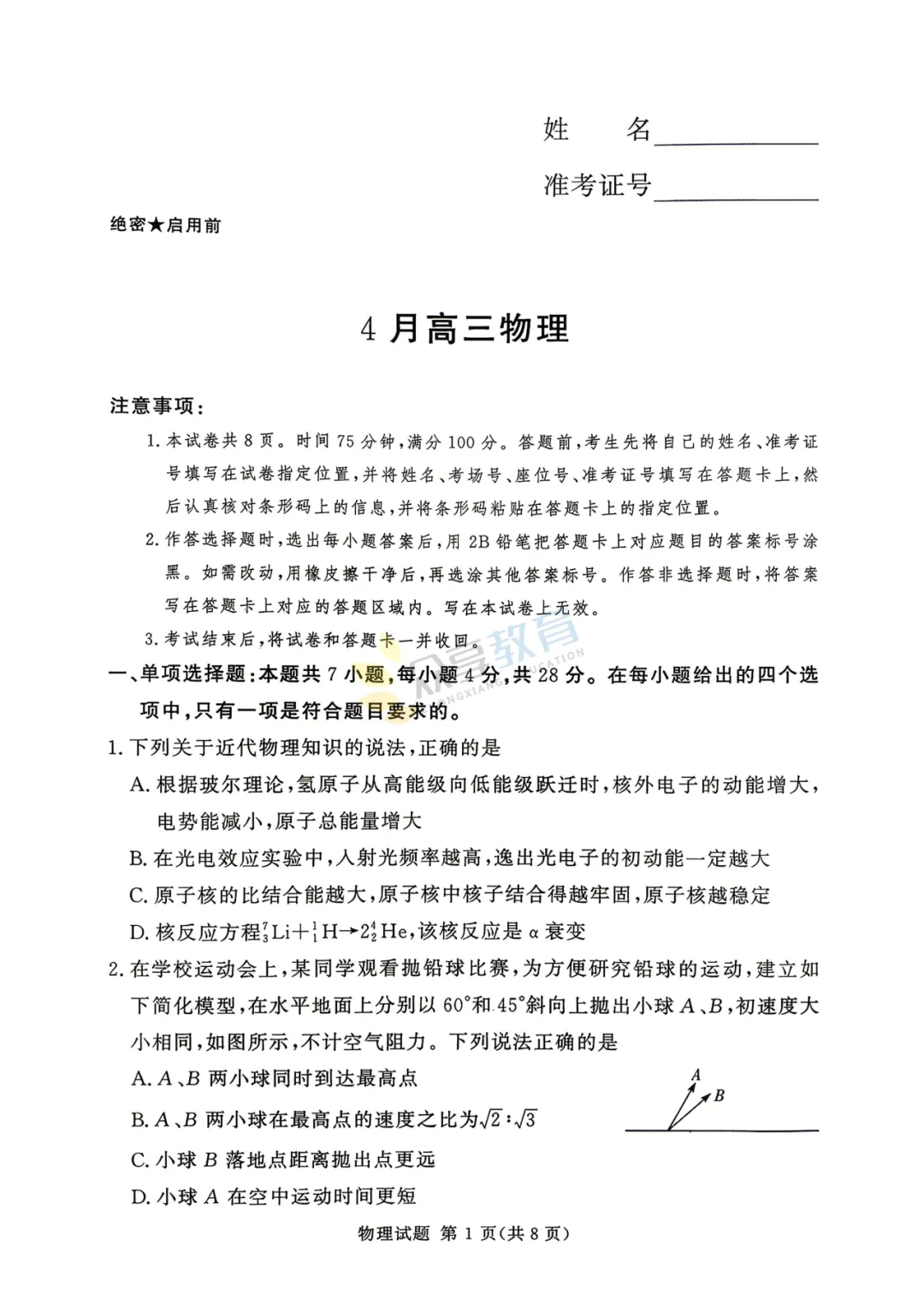 高三下学期4月阶段检测试卷(物理)