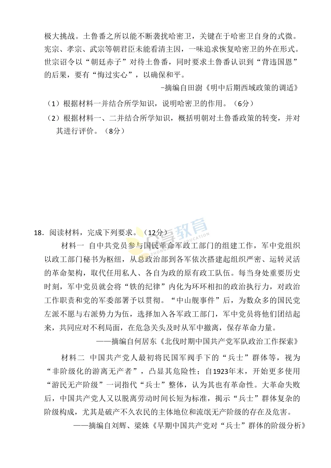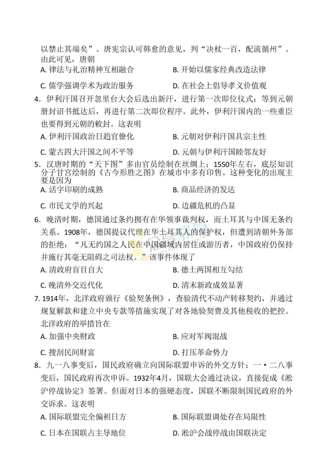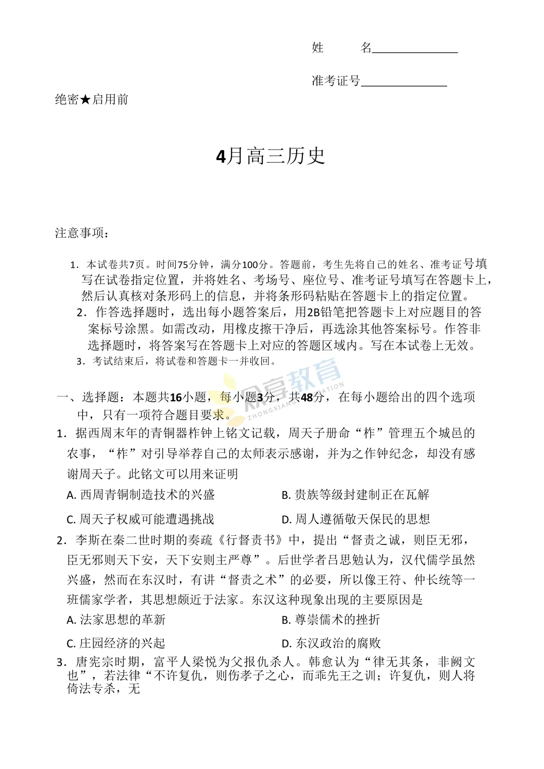 高三下学期4月阶段检测试卷(历史)