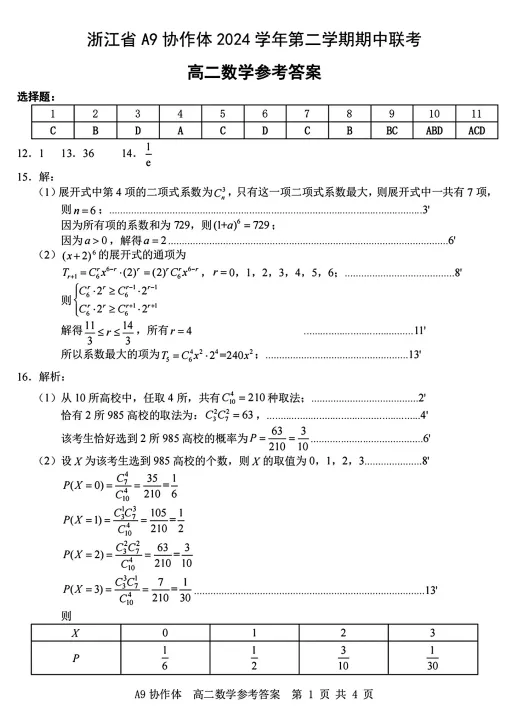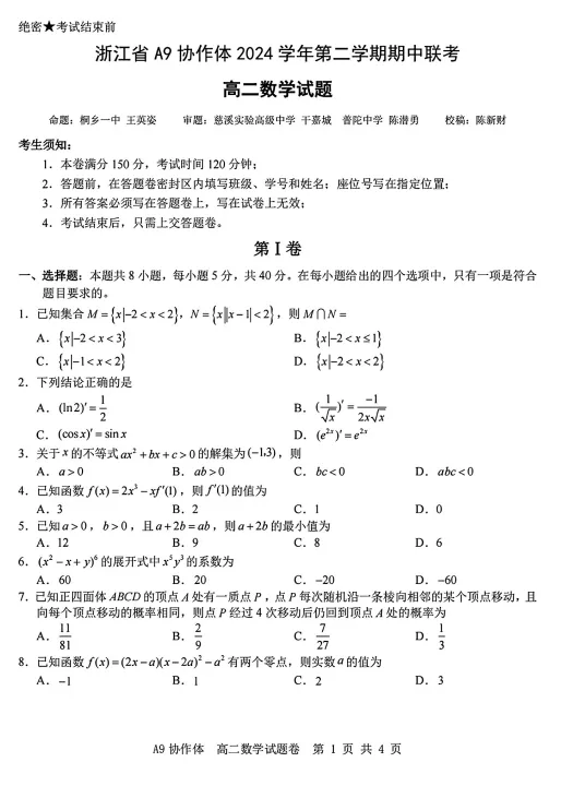 >【高二】期中丨往期试卷-浙江A9联盟2024-2025学年高二下学期4月期中