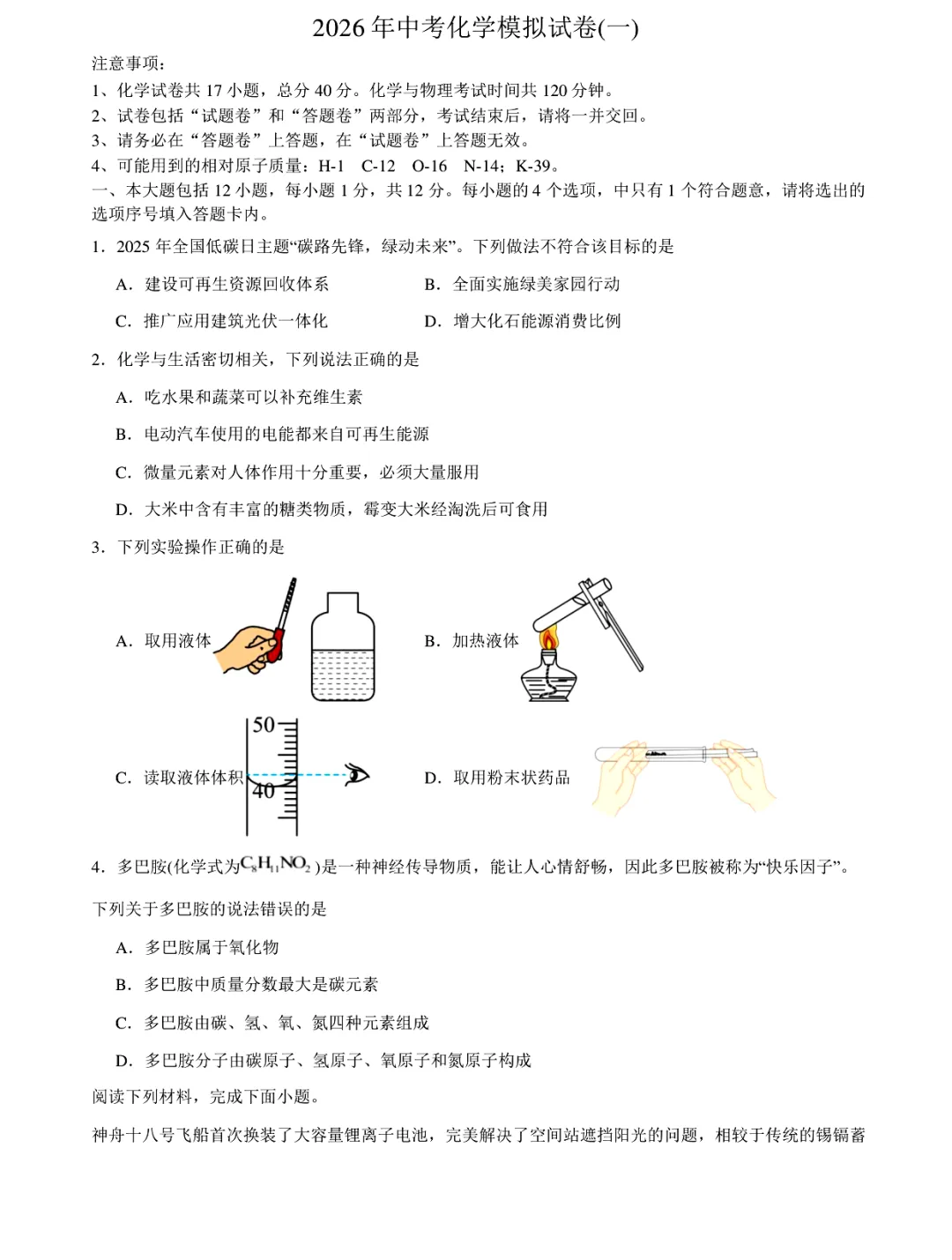 各位宝子们~今天分享📚 安徽中考化学模拟卷一,题型全面,初三的孩子可以刷起来~
