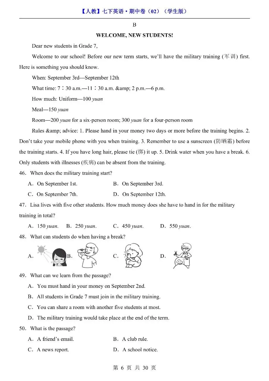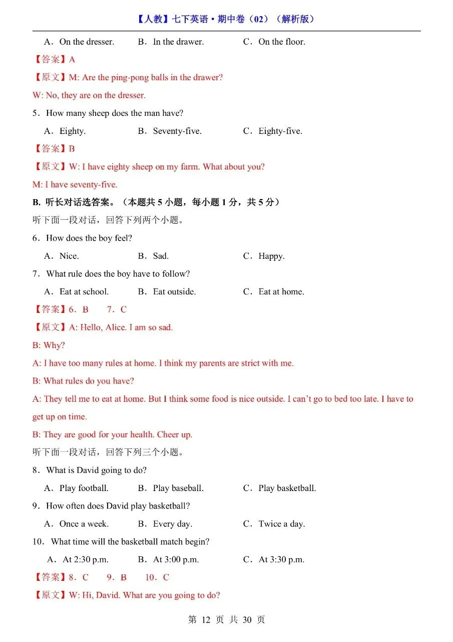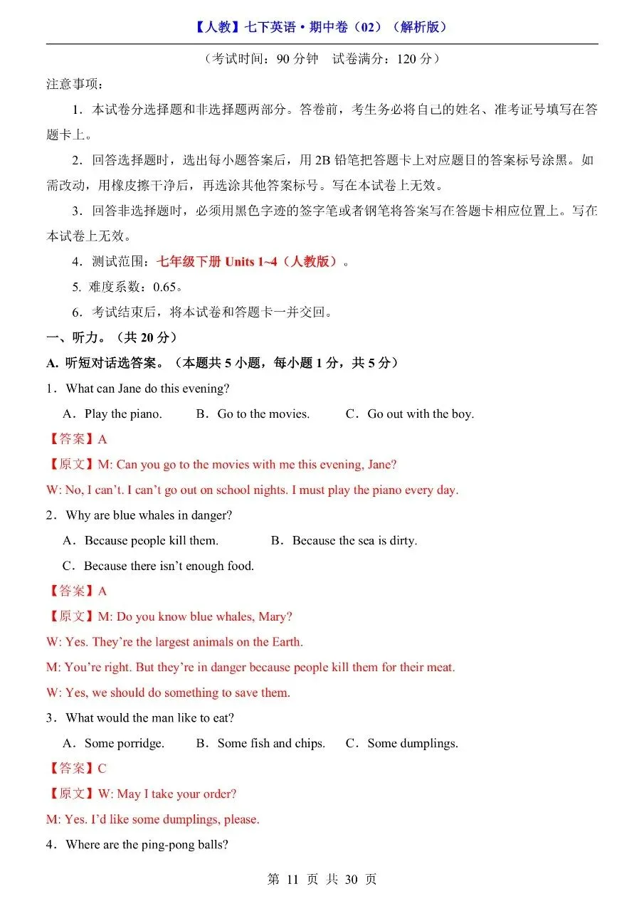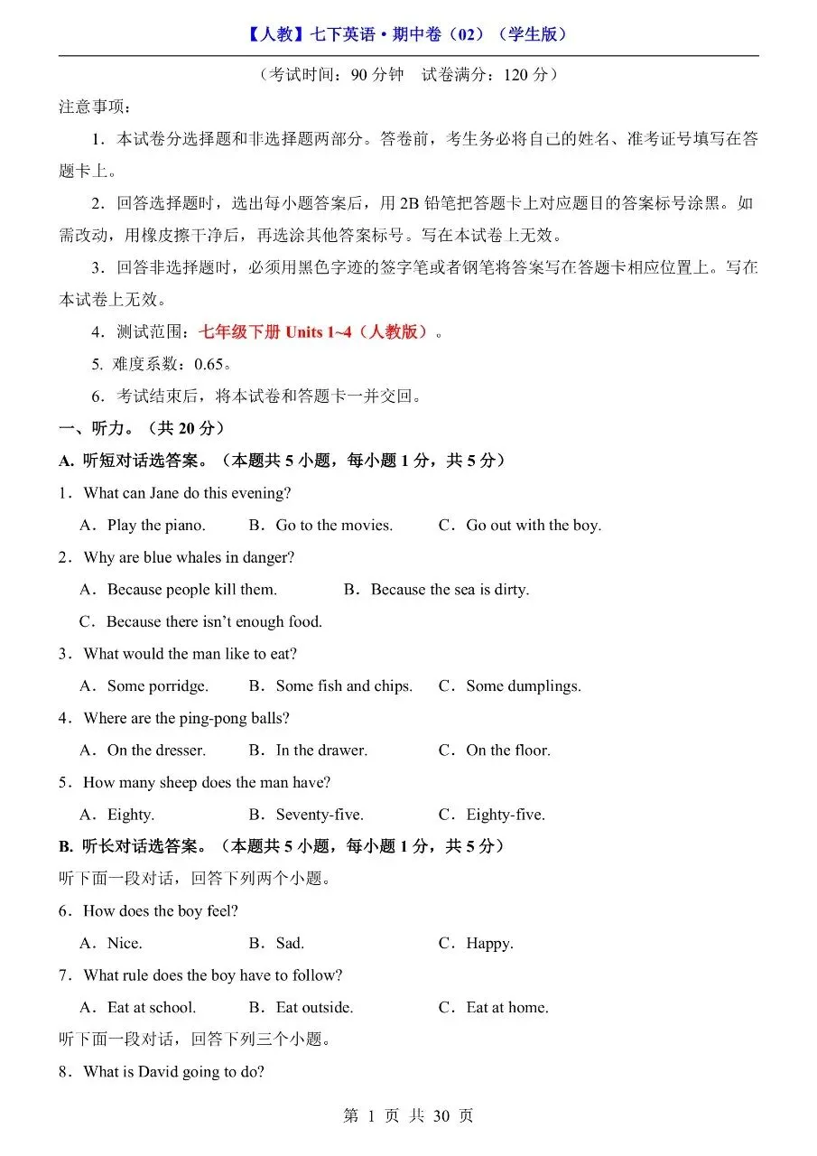 26年春七年级下册人教版英语期中考试卷【共3套】含答案,完整电子版可打印
