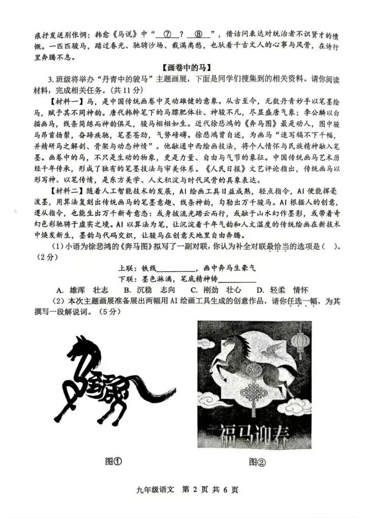 1. 主题鲜明,立德树人:全卷以“马”为文化线索,串联起“奋斗、担当、成长、家国情怀”等核心主题,实现了“以文化人、以文育人”,符合新课标要求。
