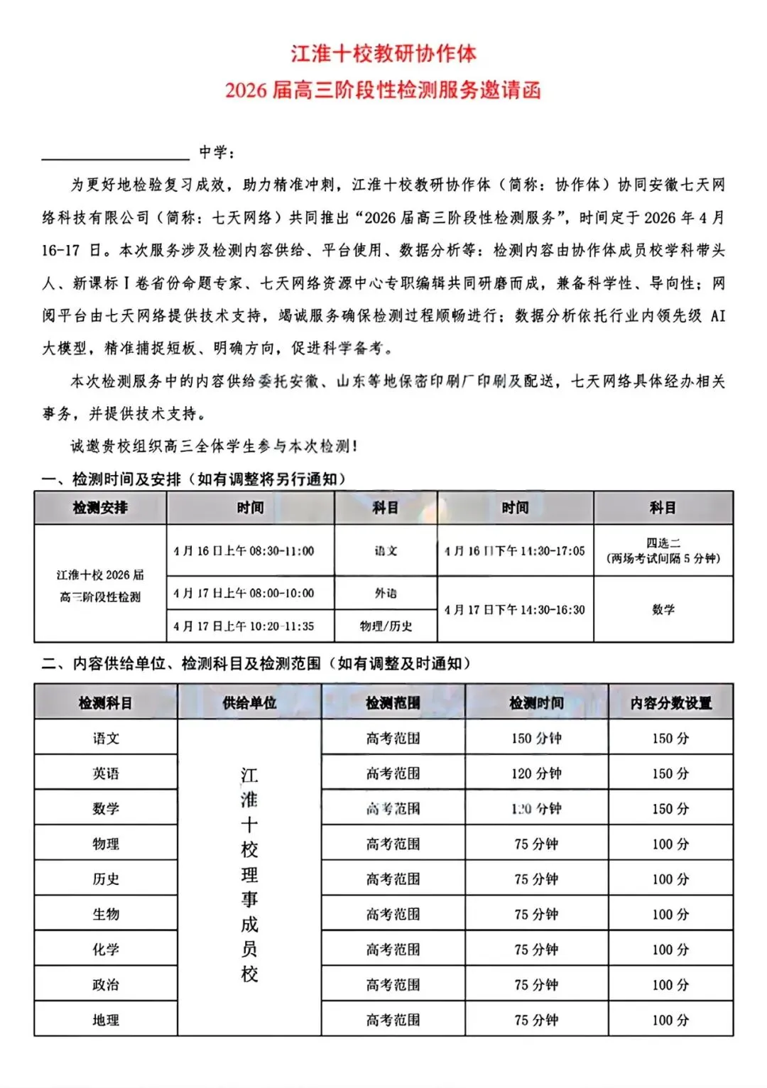 考试名称:安徽省江淮十校2026届高三4月第三次联考阶段性检测