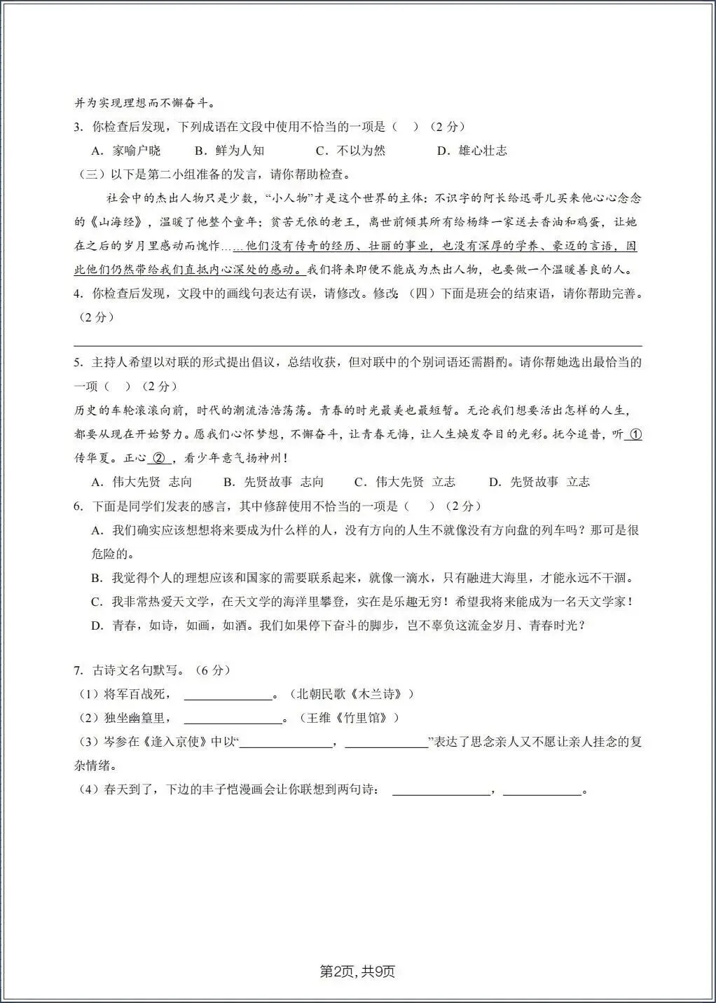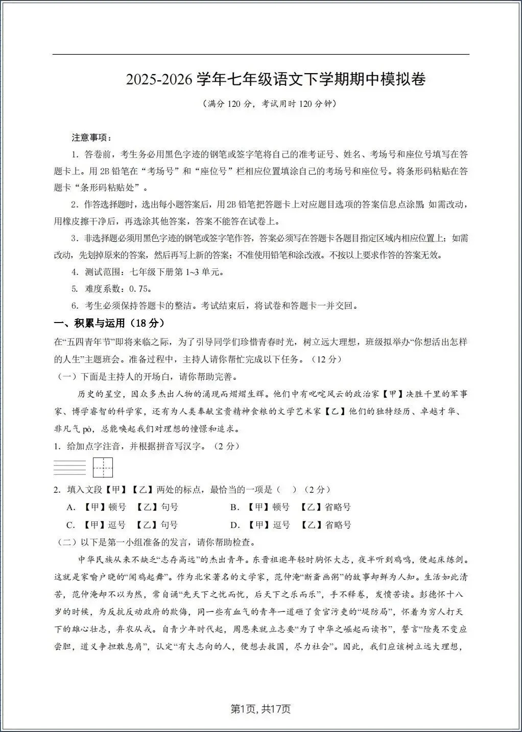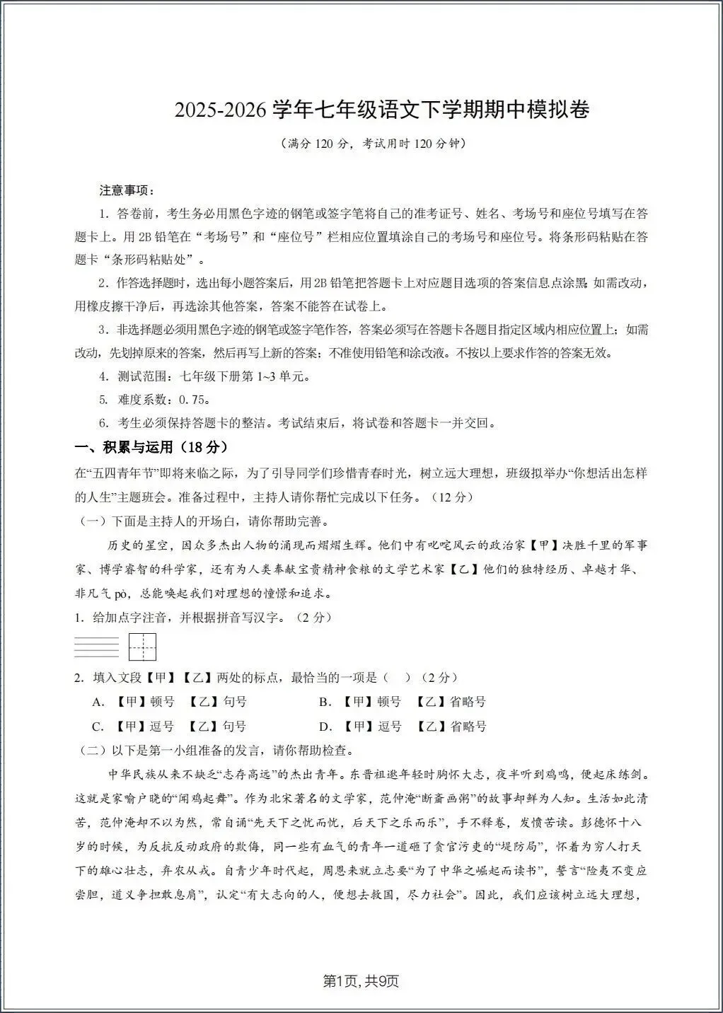 2026春新七年级下册《语文》期中试卷(共8套) 电子版可打印!
