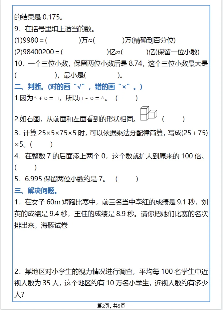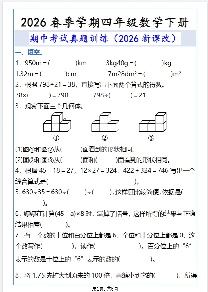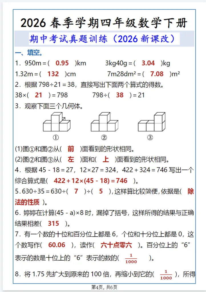 今日份分享:四年级下册数学期中专项突破,精选真题训练,查漏补缺冲高分!需要的家长可以收藏打印给孩子练起来吧!