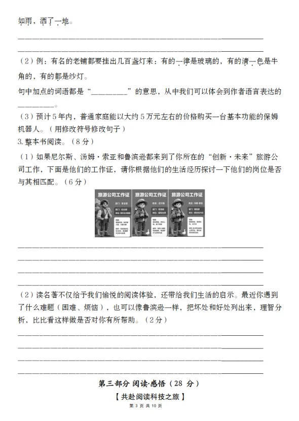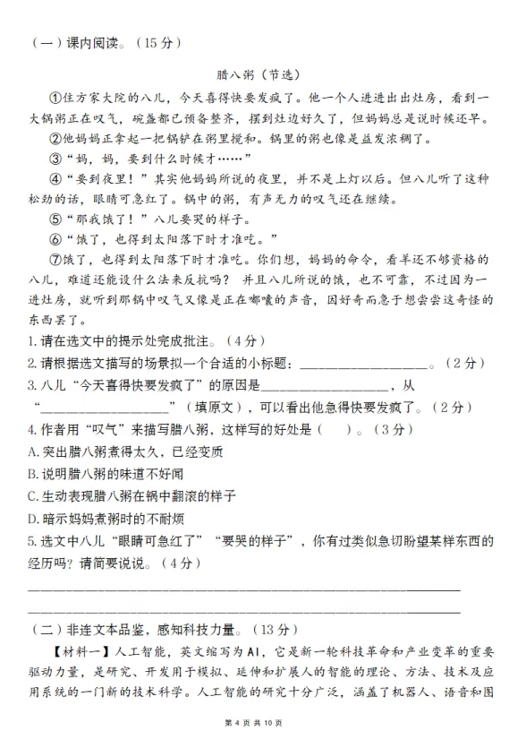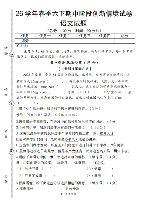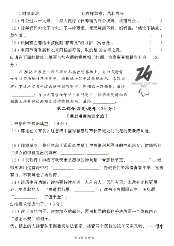 六年级下册语文小升初学业水平模拟测试卷(二)