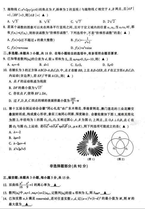 2. 多选题(9-11题):第10题在正方体背景下考查轨迹、距离最值、球的表面积,四个选项覆盖四个不同考点,综合性很强。第11题用会徽图作为向量问题的载体,体现了数学建模思想。