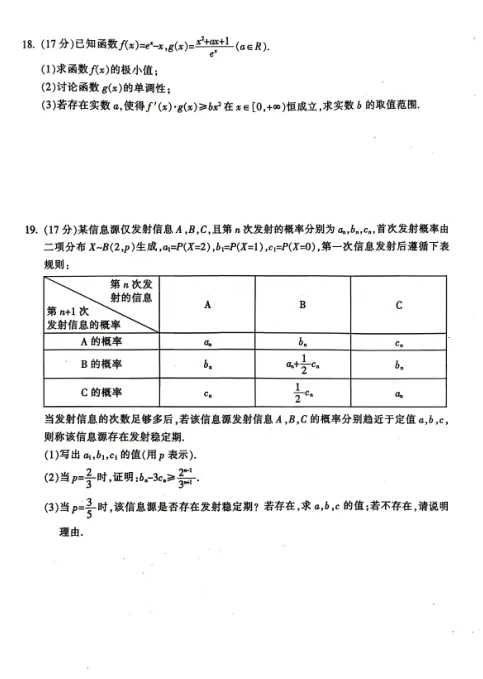 3. 解答题:第15题三角函数难度适中,第(2)问将等差数列与三角恒等变换结合,设计巧妙。第16题立体几何,第(2)问用空间向量求线面角,是常规套路,计算量适中。第17题解析几何,第(2)问的“垂线与坐标轴交点乘积范围”问题,需要联立方程、韦达定理、函数求值域,是一道典型的好题。第18题导数综合,第(3)问需要分类讨论和构造函数,对逻辑推理能力要求较高。第19题概率递推,第(3)问的稳定期问题本质是求马尔可夫链的平稳分布,属于大学内容下放,适合拔高训练。