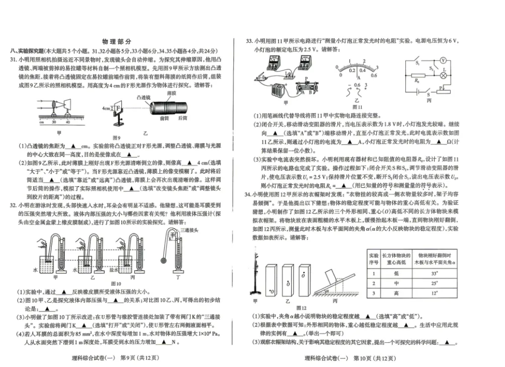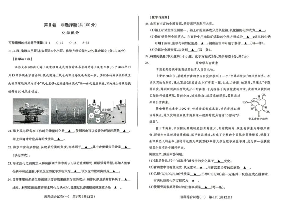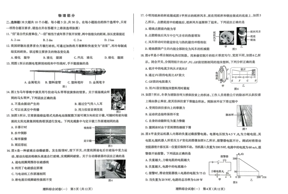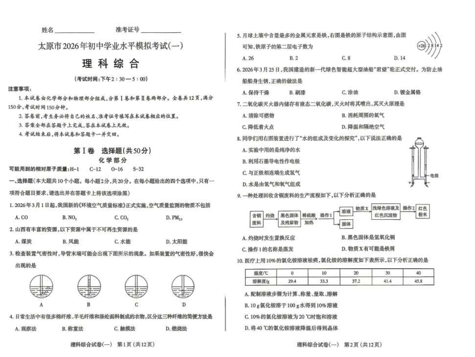 >【一模·理综】2026太原初三一模理综试卷+答案(高清电子版免费下载!)