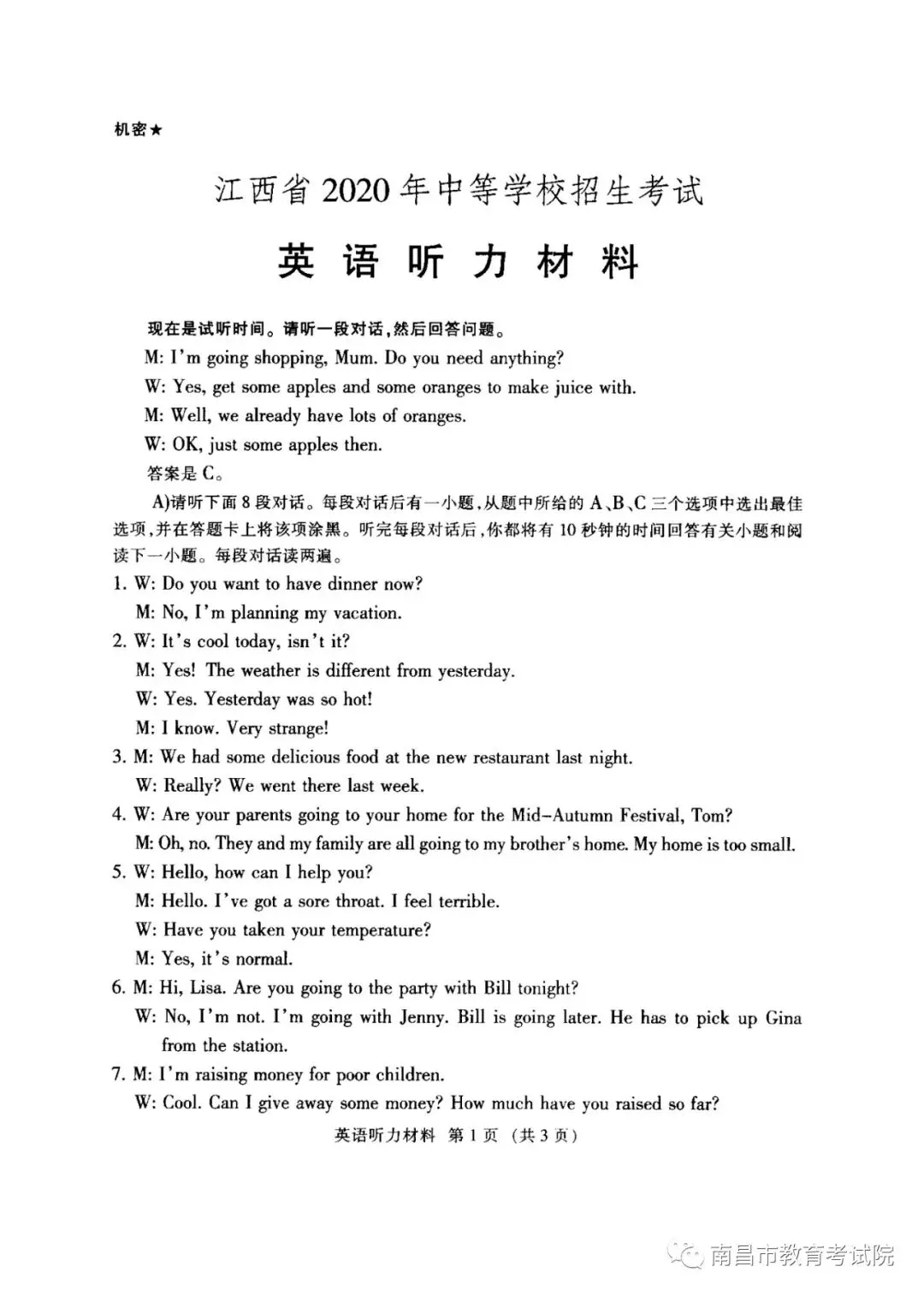 速看!江西省2020年中考官方试卷及参考答案公布!快来估分!