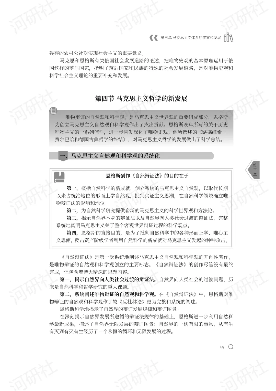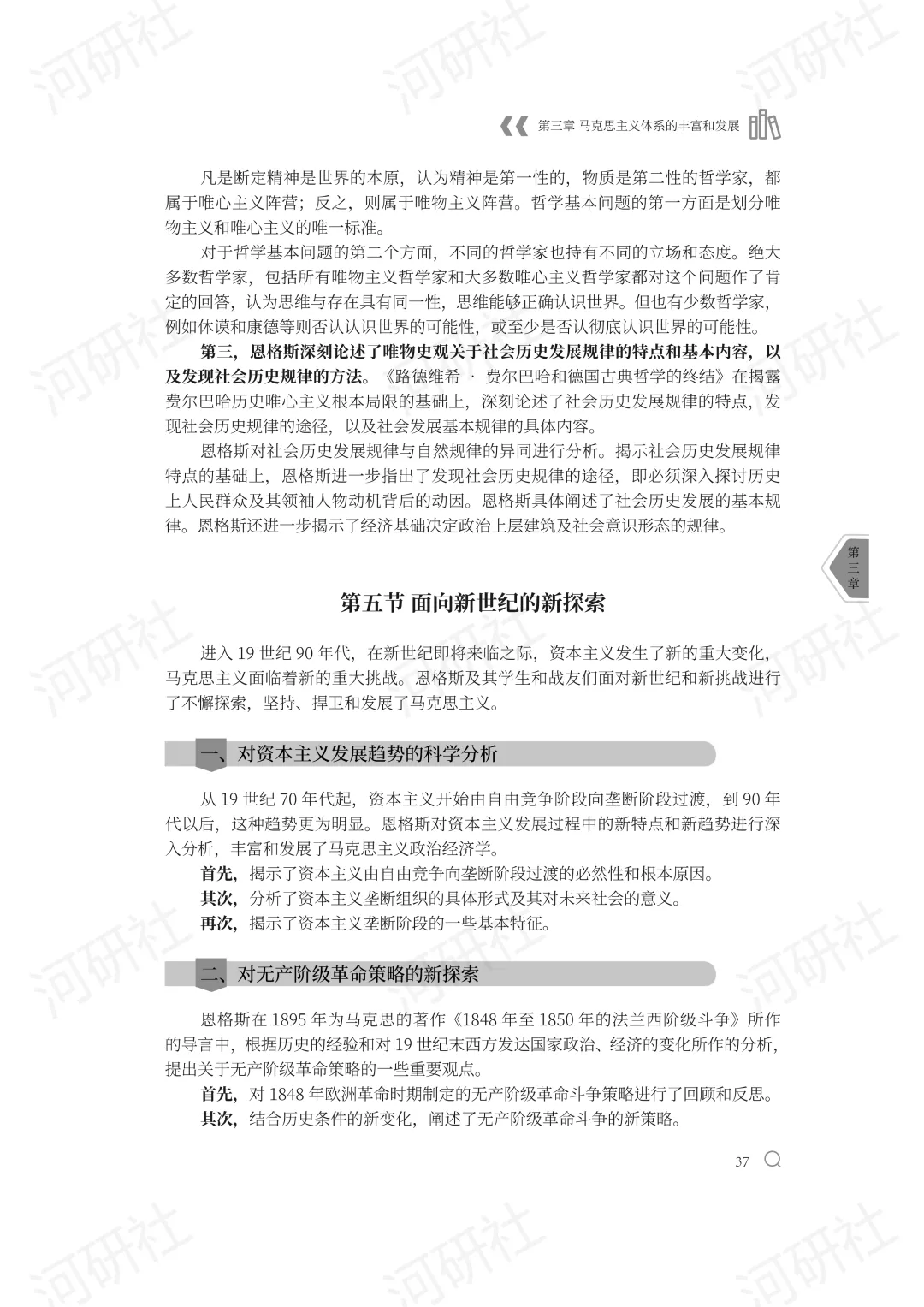 第三,恩格斯深刻论述了唯物史观关于社会历史发展规律的特点和基本内容,以及发现社会历史规律的方法。《路德维希•费尔巴哈和德国古典哲学的终结》在揭露费尔巴哈历史唯心主义根本局限的基础上,深刻论述了社会历史发展规律的特点,发现社会历史规律的途径,以及社会发展基本规律的具体内容。