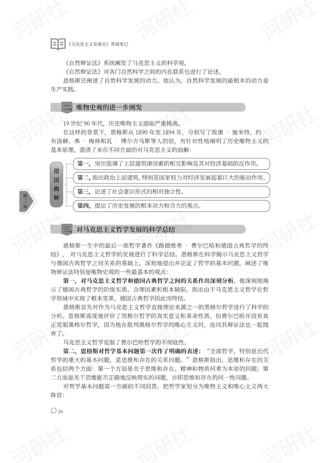 恩格斯一生中的最后一部哲学著作《路德维希•费尔巴哈和德国古典哲学的终结》,对马克思主义哲学的发展进行了科学总结。恩格斯在科学揭示马克思主义哲学与德国古典哲学之间关系的基础上,深刻地提出并论证了哲学的基本问题,阐述了唯物辩证法特别是唯物史观的一些最基本的观点:
