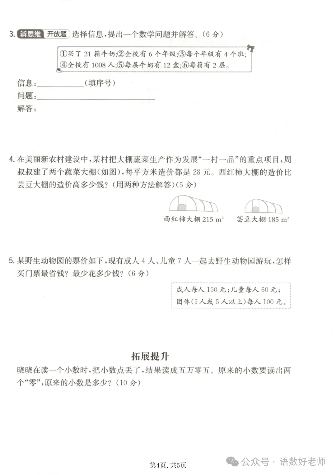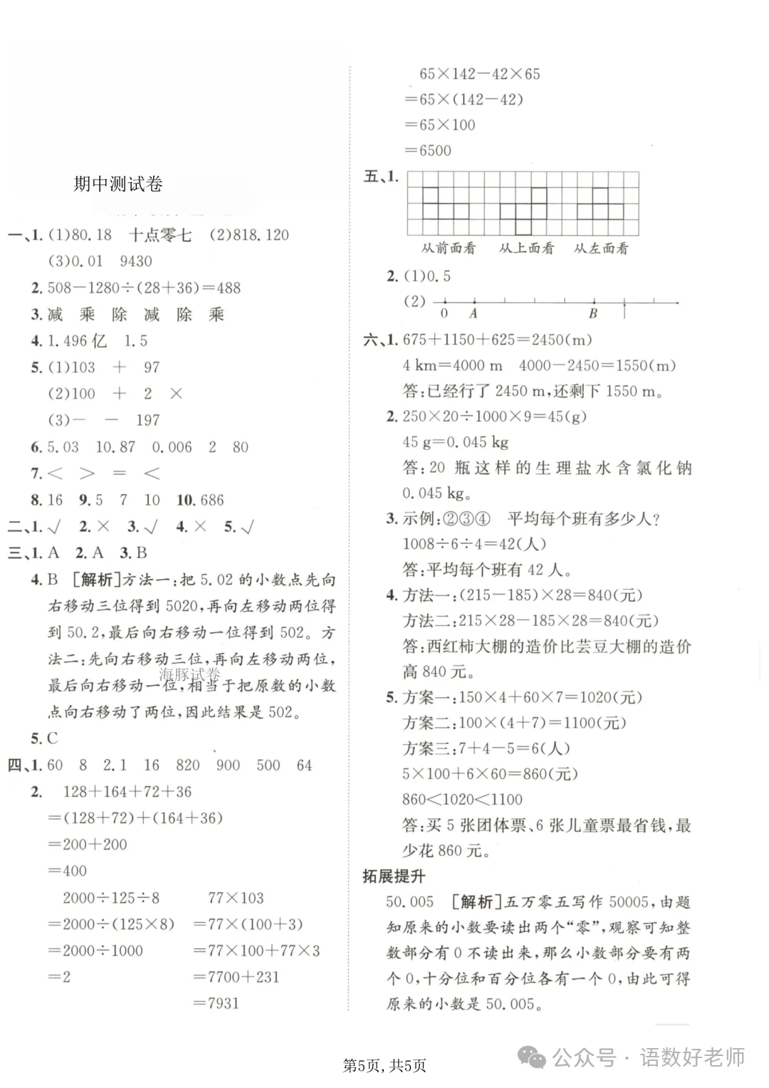 「四年级数学下册北师版26春《实验班提优大考卷》答案.pdf」