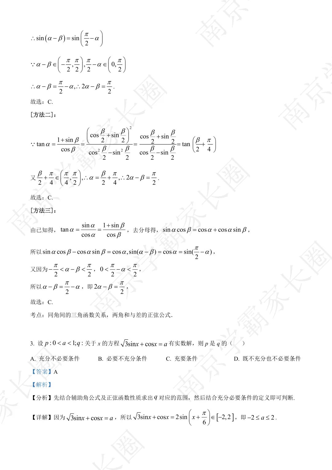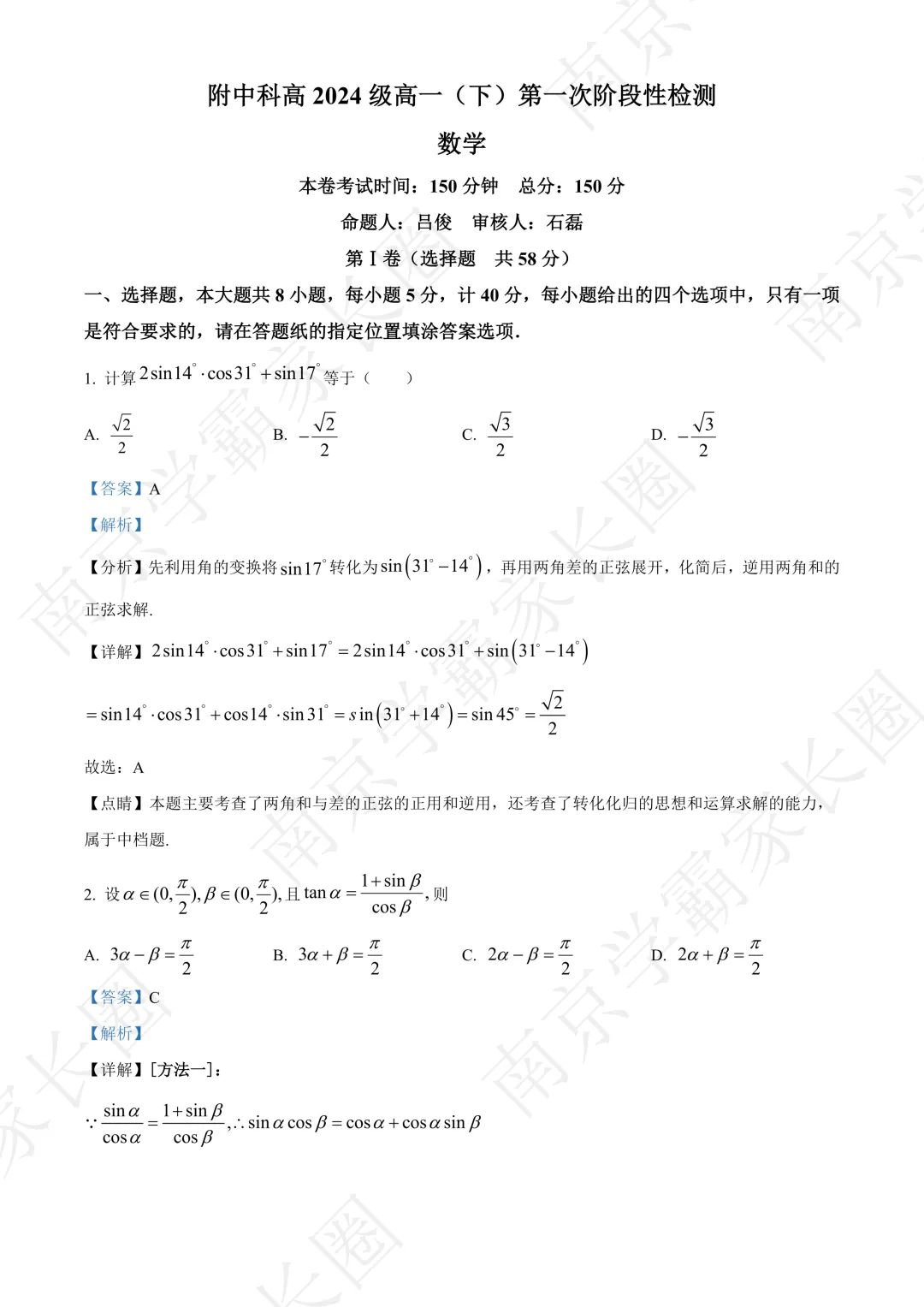 今日分享:南京市南京师范大学附属中学秦淮科技高中2024-2025学年高一下学期3月月考数学试题(解析版),可打印完整版!